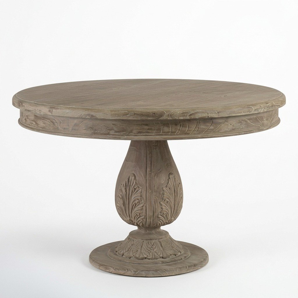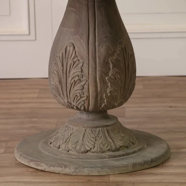 The 120 cm round tabletop offers a cozy yet functional surface ideal for everyday dining, coffee gatherings, or elegant dinner settings. Its compact round shape encourages easy conversation and creates a welcoming dining experience in both small and medium-sized spaces. The true highlight of this table is its intricately hand-carved pedestal base, inspired by classic acorn detailing. Each curve and motif is carefully sculpted by skilled artisans, creating a sculptural foundation that is both visually striking and structurally strong.