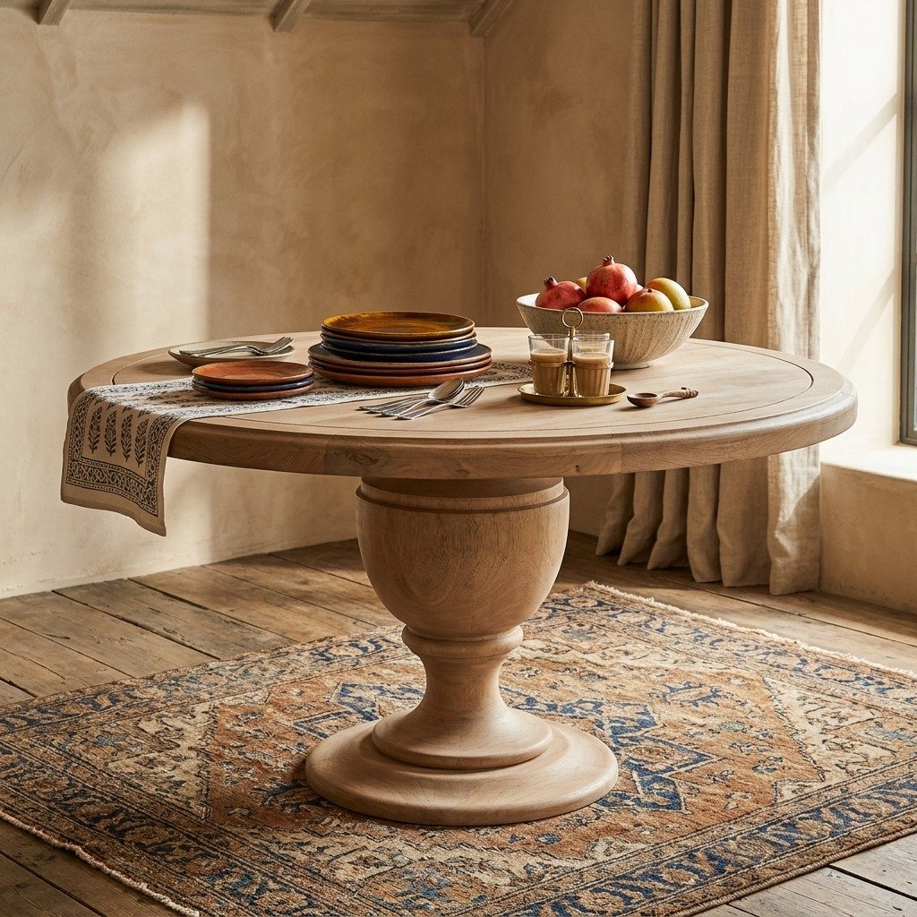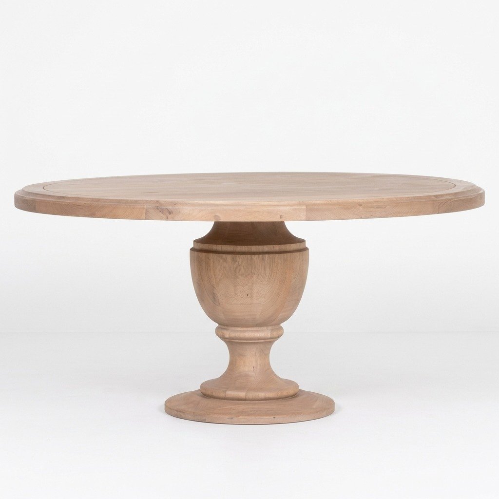 The generous 162 cm round tabletop offers ample space for family meals, festive gatherings, and casual entertaining, comfortably seating multiple guests while encouraging conversation and connection. The most striking feature of this design is its wide, hand-carved pedestal base, meticulously detailed by skilled craftsmen. The sculptural base not only adds visual depth and traditional character but also provides excellent stability and long-lasting strength.