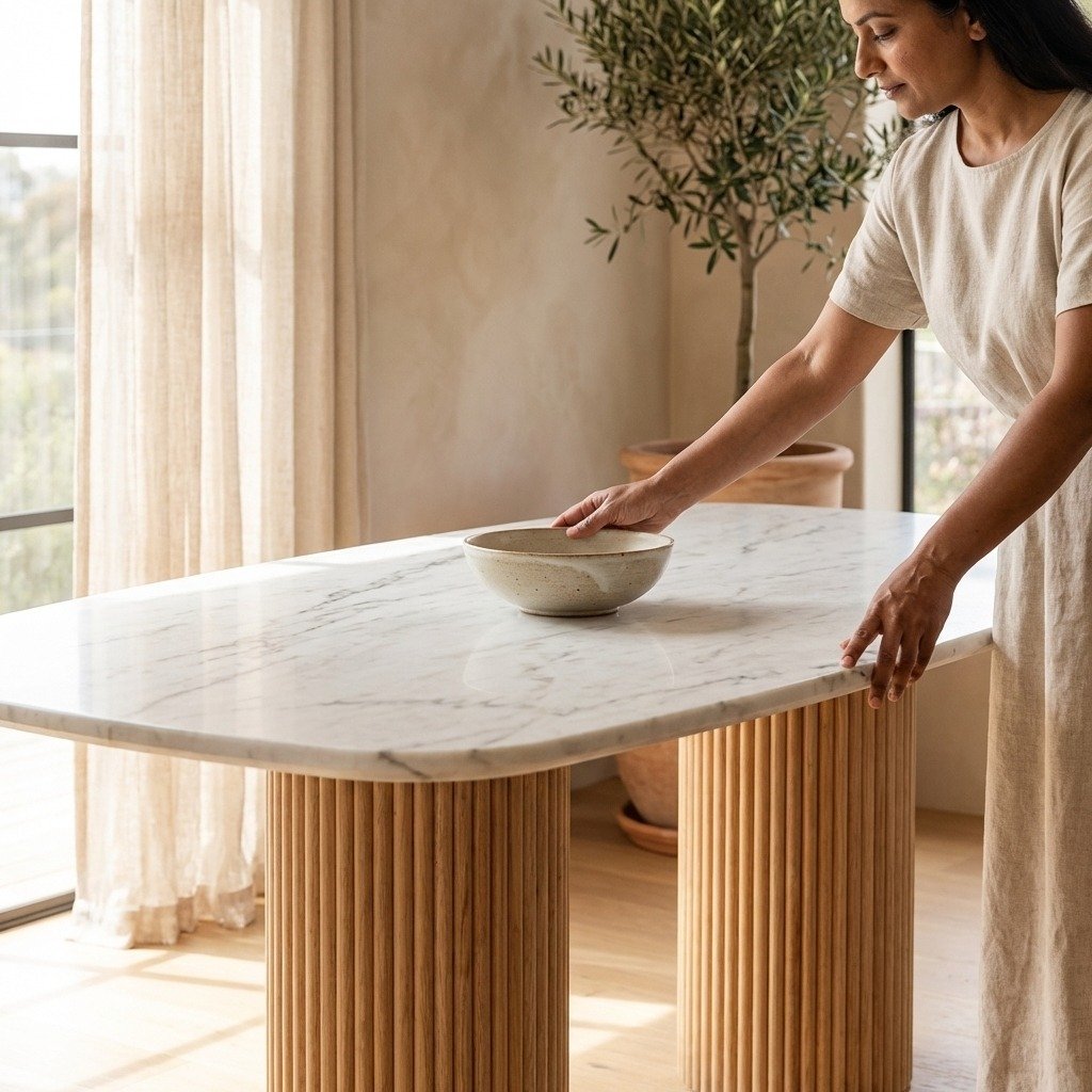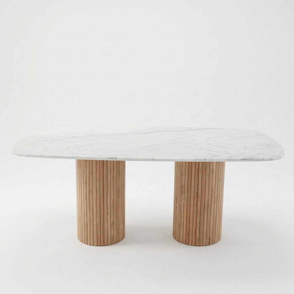 Supported by sturdy fluted wood legs, this dining table not only showcases an artistic design but also offers impressive stability and robust support, ensuring it withstands daily use while maintaining its elegant appearance. The combination of marble and wood creates a harmonious balance between elegance and functionality, making it suitable for both intimate dinners and larger gatherings. 6-Seater Marble Top Dining Table – PRITI