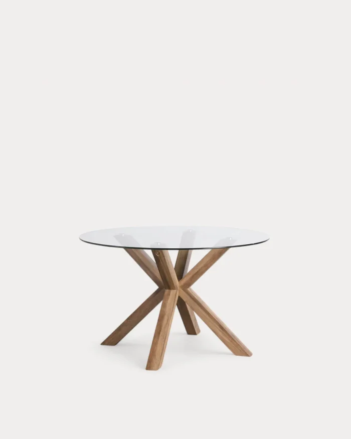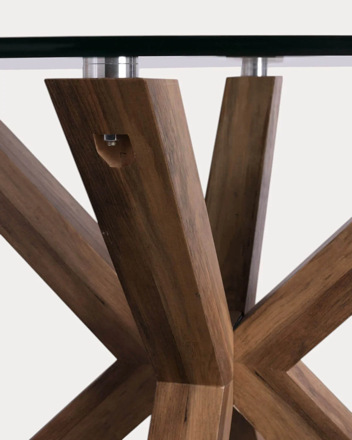 A base da mesa apresenta um formato em estrela, composta por pés cruzados feitos em MDF de alta resistência, revestido com papel impresso que reproduz fielmente o veio natural da madeira de carvalho. Esse detalhe confere um toque sofisticado e orgânico ao conjunto, garantindo um equilíbrio harmonioso entre o vidro moderno e a aconchegante aparência da madeira. A Mesa de Jantar Redonda de Madeira