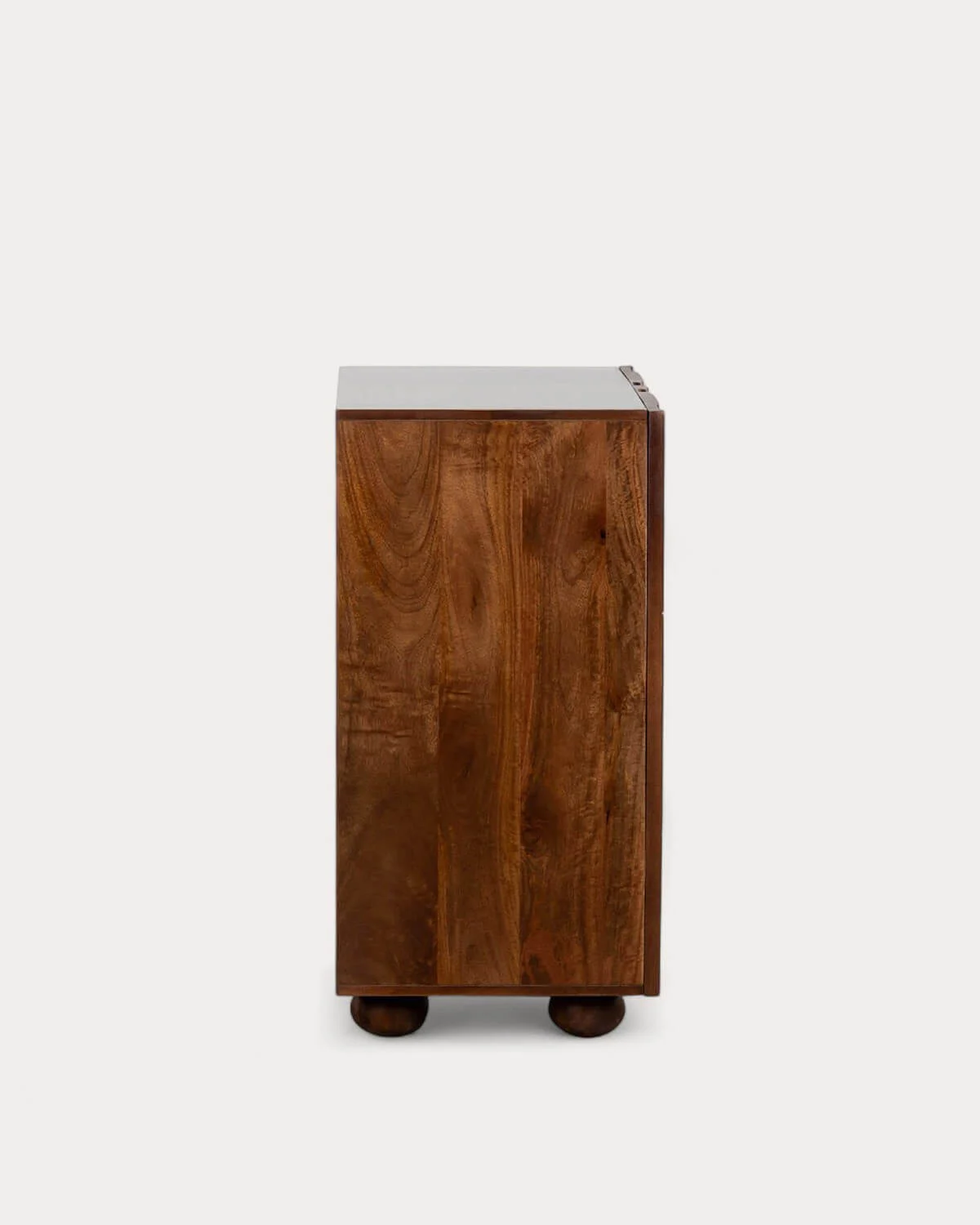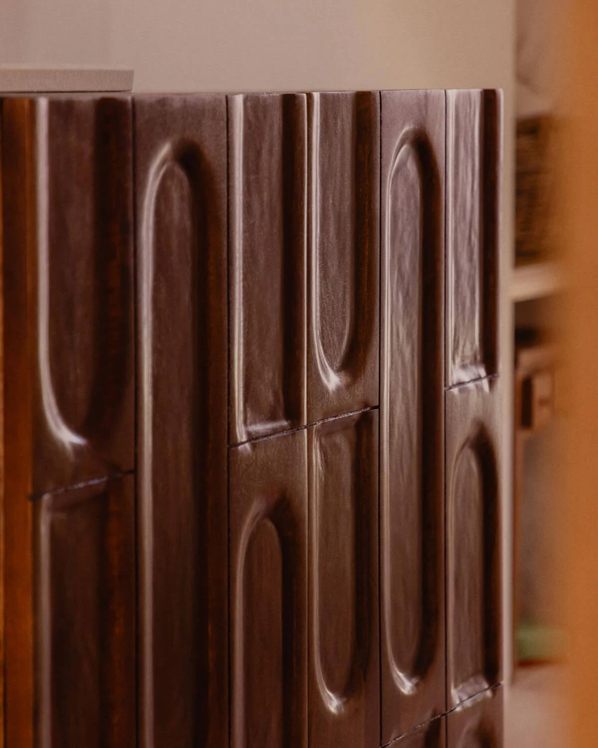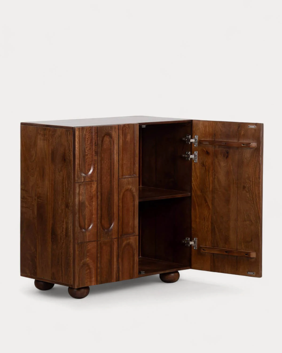 Son design se distingue par ses pieds arrondis et sa façade finement décorée, donnant à ce meuble un aspect chaleureux et contemporain. Doté de deux portes et de deux étagères internes, il propose un espace de rangement généreux, idéal pour organiser une grande variété d’objets du quotidien. Dans une salle à manger, il peut accueillir assiettes, verres, nappes ou accessoires de table. Dans un salon, il devient un meuble fonctionnel pour ranger livres, objets décoratifs, bougies, appareils multimédia ou autres éléments indispensables.