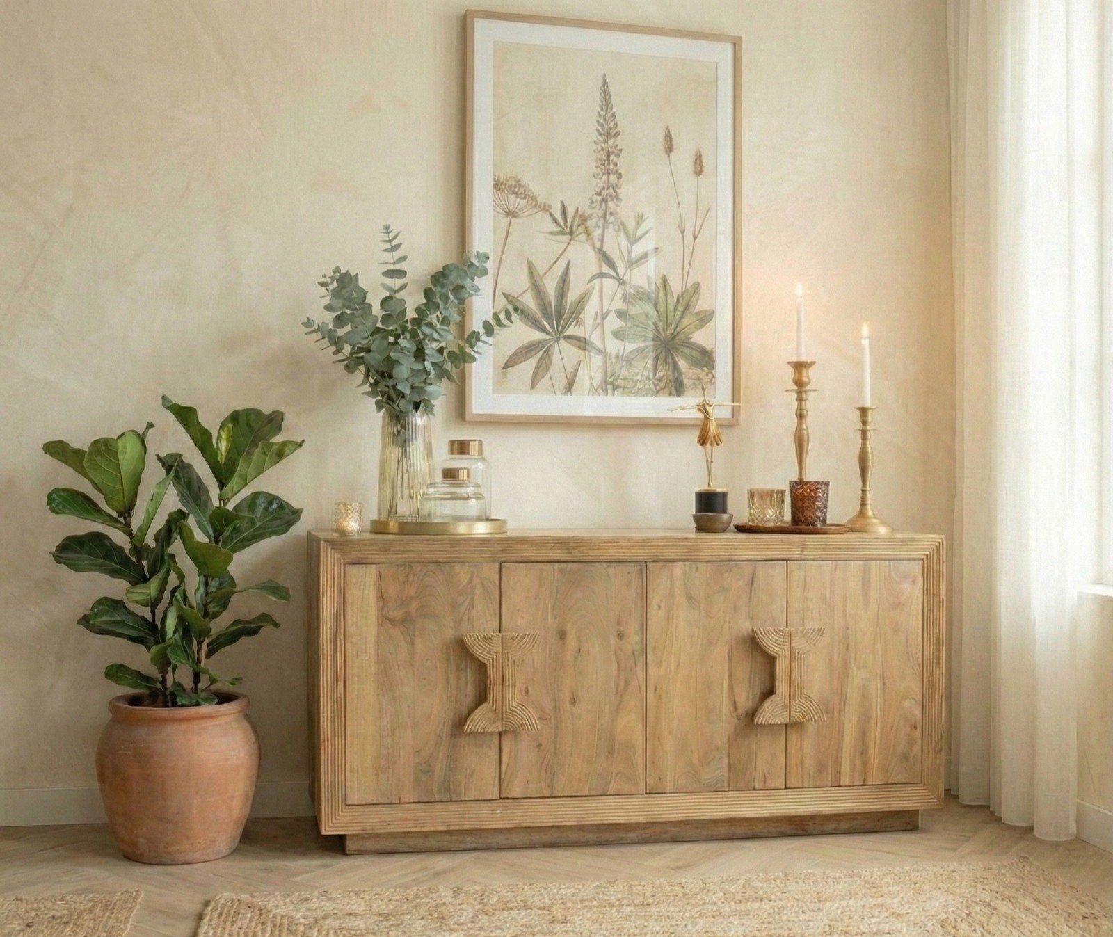 Gracias a su estética versátil, el aparador Lonnie se adapta con facilidad a diferentes estilos de decoración: desde interiores nórdicos y naturales hasta ambientes contemporáneos y modernos. Su acabado en tonos suaves de madera aporta luminosidad y equilibrio visual al espacio. Aparador Lonnie de madera de acacia