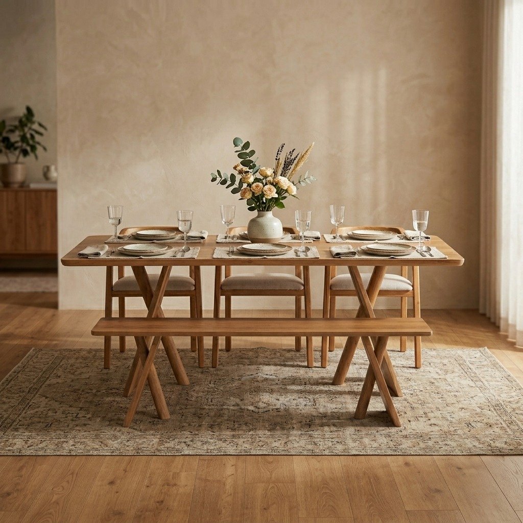 Its striking X-leg base serves as both a bold design statement and a stable foundation, ensuring durability and everyday usability. The spacious rectangular tabletop comfortably accommodates family meals, casual gatherings, or work sessions, while providing ample legroom for multiple chairs. The hand-finished surface delivers a smooth, refined touch, combining artisanal quality with modern sophistication.