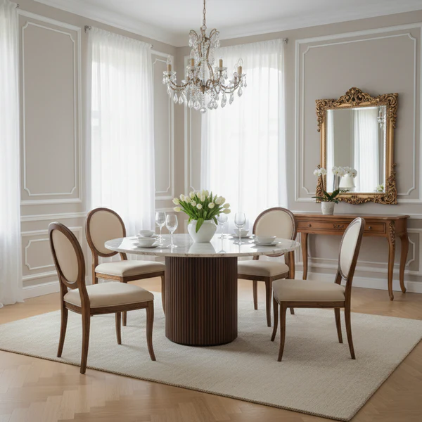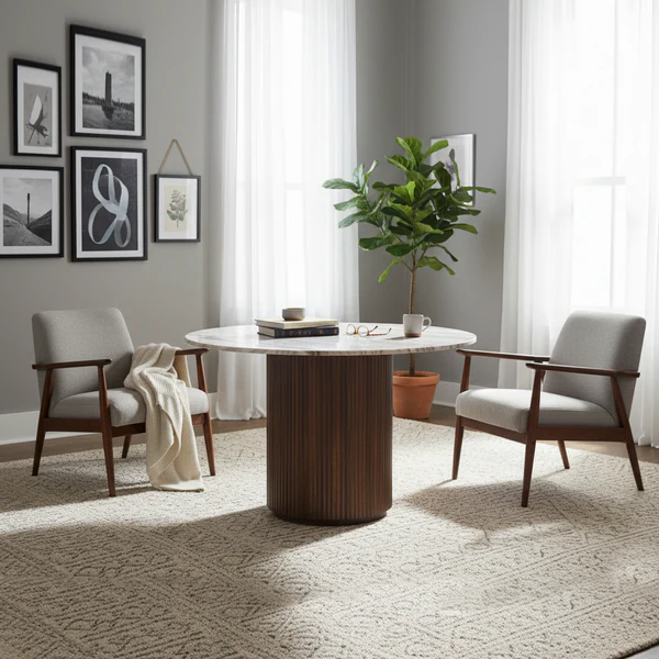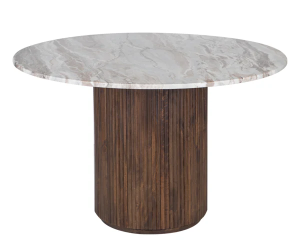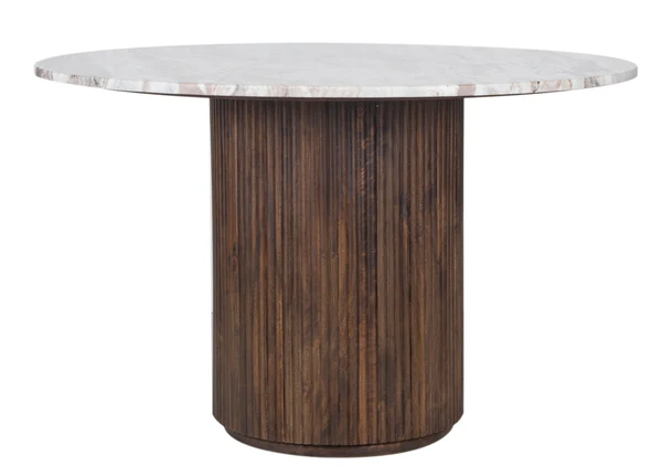 Le plateau repose sur un piètement sculptural en bois massif de manguier, dont la forme cylindrique est enrichie de rainures verticales qui apportent profondeur visuelle et caractère architectural. Les teintes chaudes et naturelles du bois contrastent élégamment avec la fraîcheur du marbre, créant un équilibre harmonieux entre matériaux nobles et design contemporain. Ce mariage subtil de bois et de pierre confère à la table Kfir un style intemporel qui s’intègre aussi bien dans les intérieurs modernes que dans les décors plus classiques. bois massif de manguier