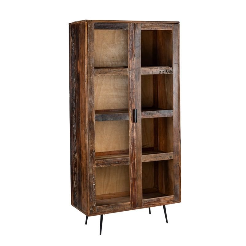 bois-massif-recycle-metal-noir Apportez à votre séjour ou votre cuisine une pièce à la fois pratique et élégante avec ce vaisselier 100 x 45 x h200 cm, entièrement fabriqué artisanalement à partir de bois massif recyclé. Ce meuble de rangement allie durabilité, authenticité et esthétisme grâce à son bois recyclé soigneusement sélectionné. Chaque planche est unique : variations naturelles de teintes, nœuds, reliefs et marques du temps confèrent au meuble un caractère singulier et intemporel, propre à la Collection PRITI.