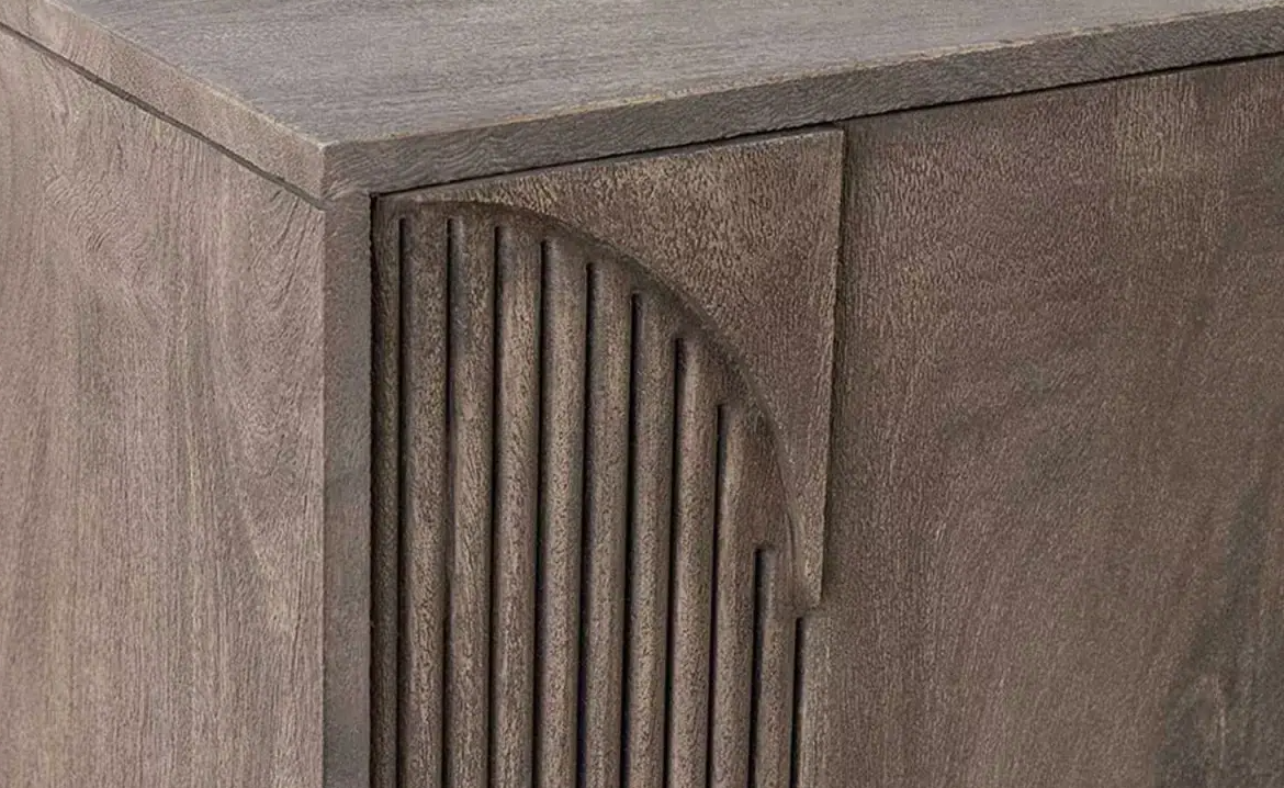 Chaque façade est finement sculptée à la main, offrant un véritable travail d’artisanat qui capte la lumière et met en valeur les nuances subtiles du manguier grisé. Ces détails sculptés ajoutent relief, élégance et personnalité à votre pièce, transformant ce buffet en un élément central de votre décoration. Buffet 170 cm end Maguire Massif Gries