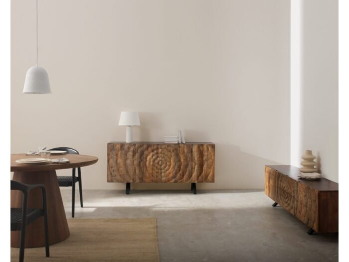 Le Buffet 3 portes bois massif de 33 est un meuble élégant et fonctionnel, pensé pour apporter caractère et organisation à votre intérieur. Son design rectangulaire aux lignes épurées s’intègre parfaitement dans un salon moderne, une salle à manger contemporaine ou une entrée design. La façade texturée en relief fantaisie confère à ce buffet en bois de manguier une touche décorative distinctive, faisant de ce meuble un véritable élément central de la pièce.