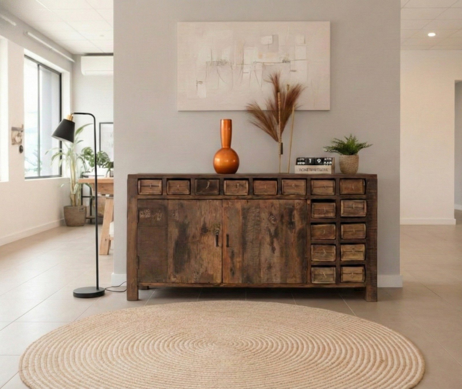 Ce buffet en bois recyclé allie durabilité et esthétisme, offrant un mobilier fonctionnel et respectueux de l’environnement. Idéal pour la salle à manger, le salon, une véranda ou même un atelier, il devient un élément décoratif fort, mêlant esprit ethnique, chaleur du bois et style contemporain. Facile d’entretien, il suffit d’un chiffon doux pour le dépoussiérer et de nourrir le bois tous les 2 à 3 ans pour conserver son éclat naturel.