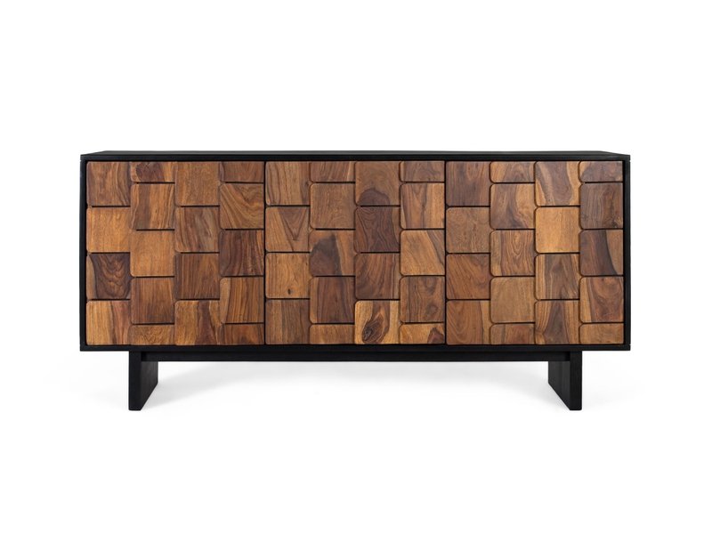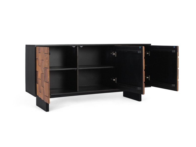 La façade se distingue par ses trois portes en bois de sheesham, travaillées en relief pour créer un effet tridimensionnel unique. Ce jeu de volumes met en valeur le grain naturel du bois et apporte du caractère à l’ensemble. Le système d’ouverture par simple pression assure une utilisation fluide et élégante, sans poignées apparentes, renforçant la pureté des lignes.
