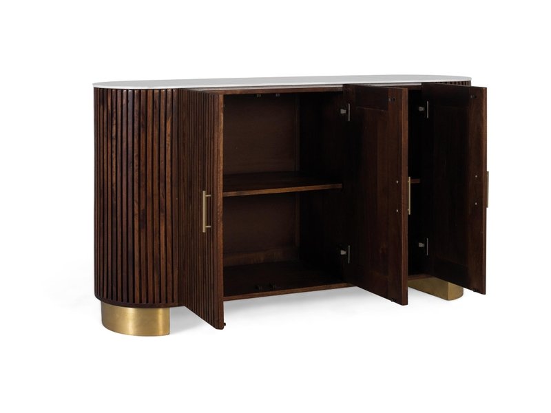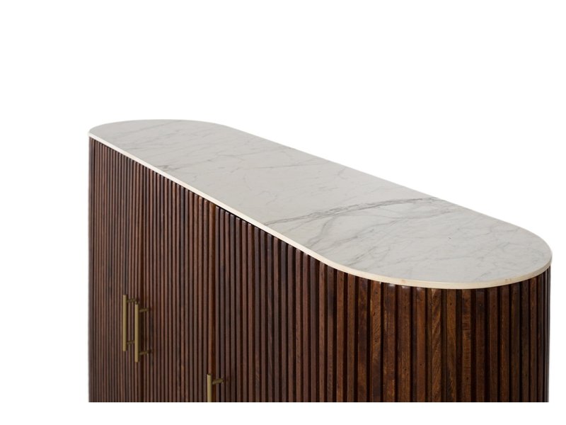 Ce Buffet en bois de manguier 25 finition noyer est une pièce de mobilier raffinée qui conjugue parfaitement design contemporain, matériaux nobles et fonctionnalité. Conçu pour sublimer les intérieurs modernes et élégants, il se distingue par sa structure aux côtés incurvés, apportant douceur visuelle et lignes fluides à l’ensemble. Son plateau en marbre synthétique blanc veiné de gris ajoute une touche luxueuse et lumineuse, tout en étant facile à entretenir au quotidien.