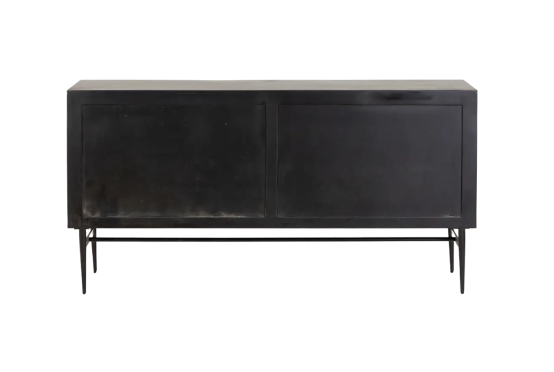 Derrière ses quatre portes battantes, ce buffet contemporain propose un grand espace de rangement pratique et bien organisé, parfait pour accueillir votre vaisselle, votre linge de table ou vos objets du quotidien. Son piétement fin en métal noir, à la fois solide et élégant, surélève la structure et apporte une sensation de légèreté tout en renforçant la stabilité de l’ensemble.