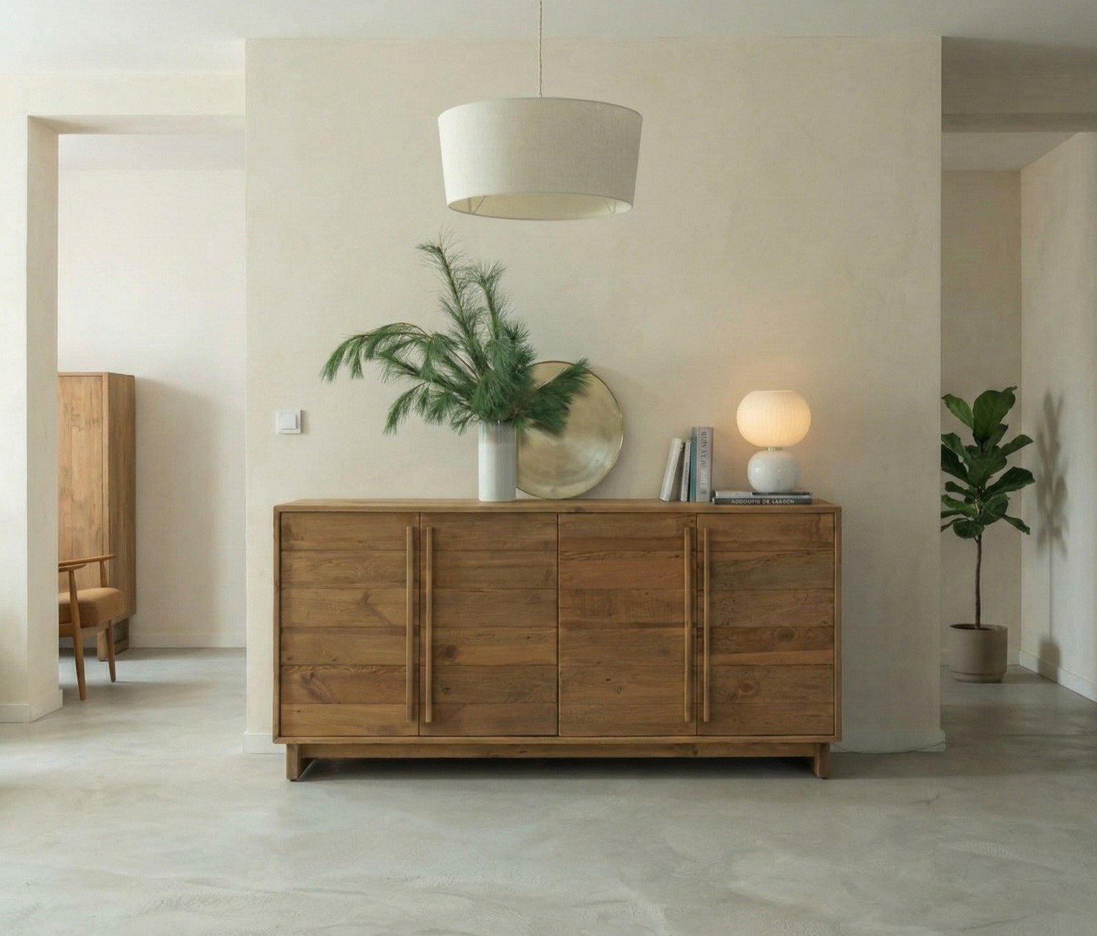 Fonctionnel au quotidien, ce buffet en bois recyclé dispose de quatre portes dissimulant un vaste espace de rangement. Il est idéal pour organiser vaisselle, linge de maison, dossiers ou objets du quotidien tout en conservant un espace ordonné. Son large plateau supérieur offre également une surface parfaite pour exposer des objets décoratifs, cadres, vases ou luminaires.