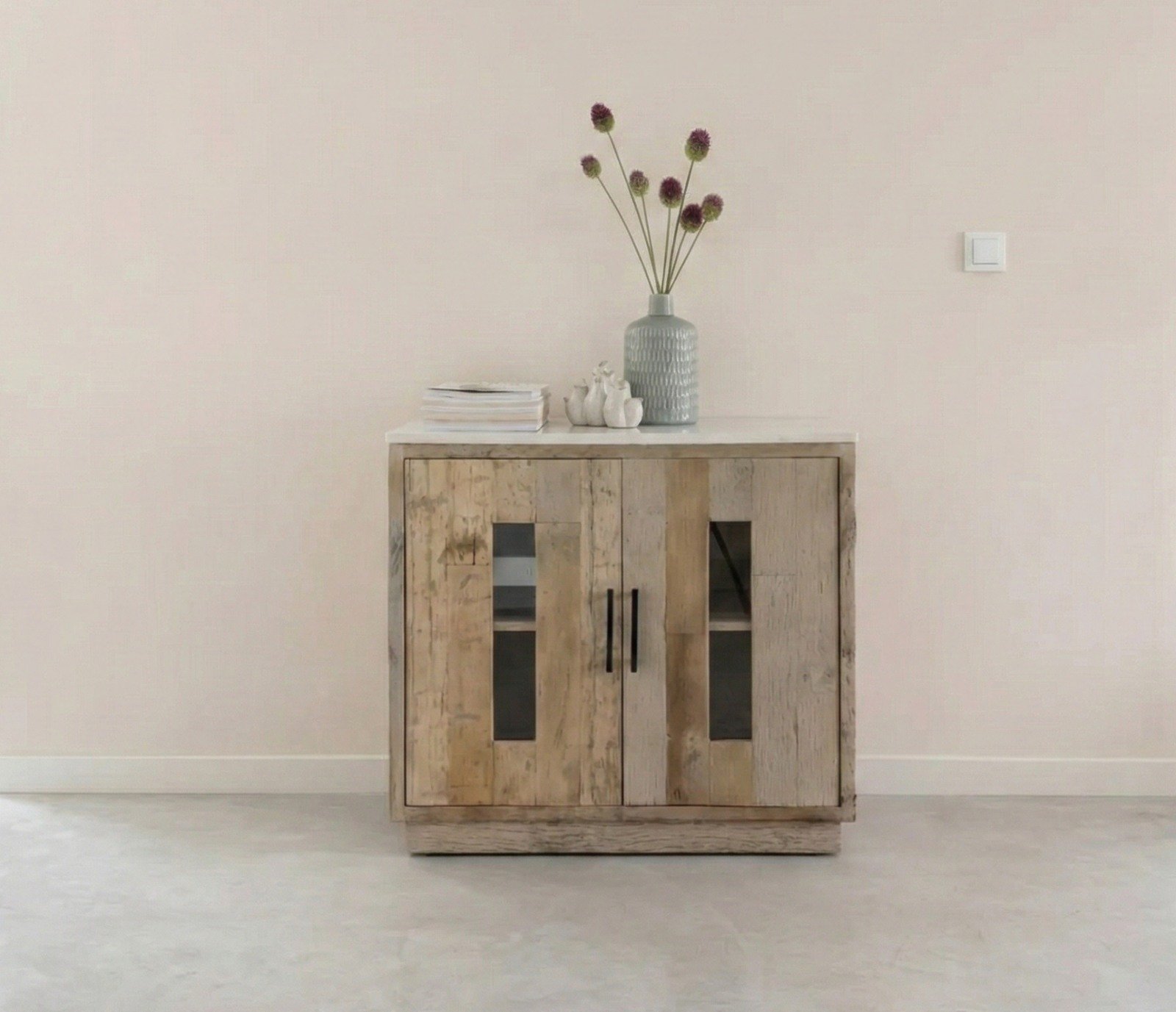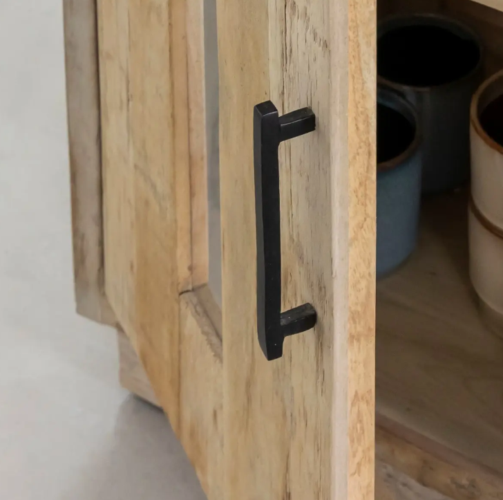 Les deux portes vitrées avec poignées métalliques noires offrent un contraste subtil et contemporain. Elles permettent de mettre en valeur votre vaisselle, vos livres ou vos objets décoratifs tout en les protégeant de la poussière. Chaque détail témoigne d’un savoir-faire artisanal, où la qualité des finitions et le choix des matériaux sont pensés pour durer.