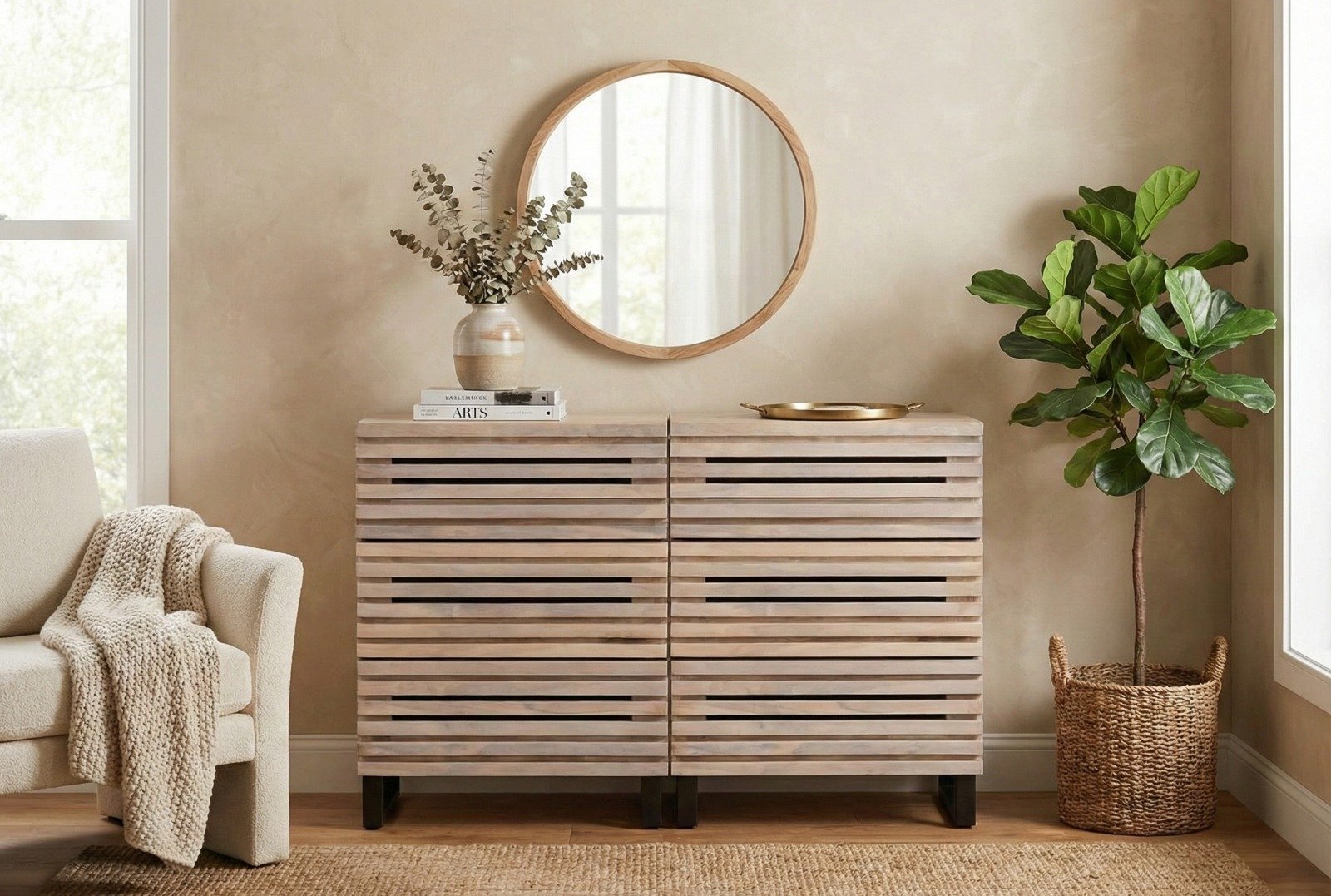 Fabriqués en bois de manguier massif avec finition blanchie, ces buffets se distinguent par la beauté naturelle de leurs veines et par leurs variations de teintes uniques. Chaque pièce est différente, ce qui garantit un meuble exclusif et plein de charme. Le cadre en acier assure une structure solide, stable et durable, idéale pour un usage quotidien. Buffet industriel en bois de 33