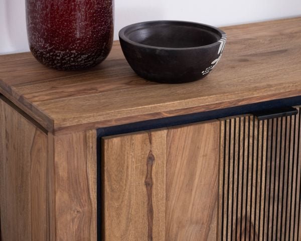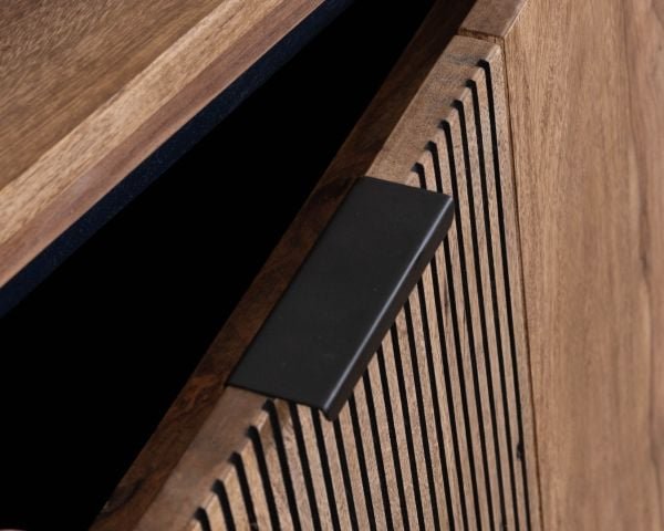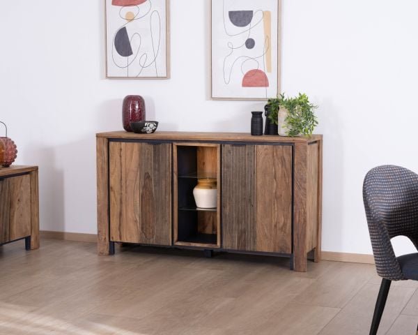 Avec des dimensions généreuses de 150 cm de longueur, 40 cm de profondeur et 85 cm de hauteur, ce meuble offre un grand espace de rangement grâce à ses placards avec étagères amovibles et sa niche centrale en verre équipée d’un éclairage LED intégré, parfait pour mettre en valeur vos objets décoratifs. Les portes sur charnières sont équipées d’un système de fermeture par butée bois, garantissant une utilisation sûre et silencieuse. Les poignées en métal noir apportent une touche contemporaine et élégante. Buffet moderne en palissandre et acacia avec éclairage LED