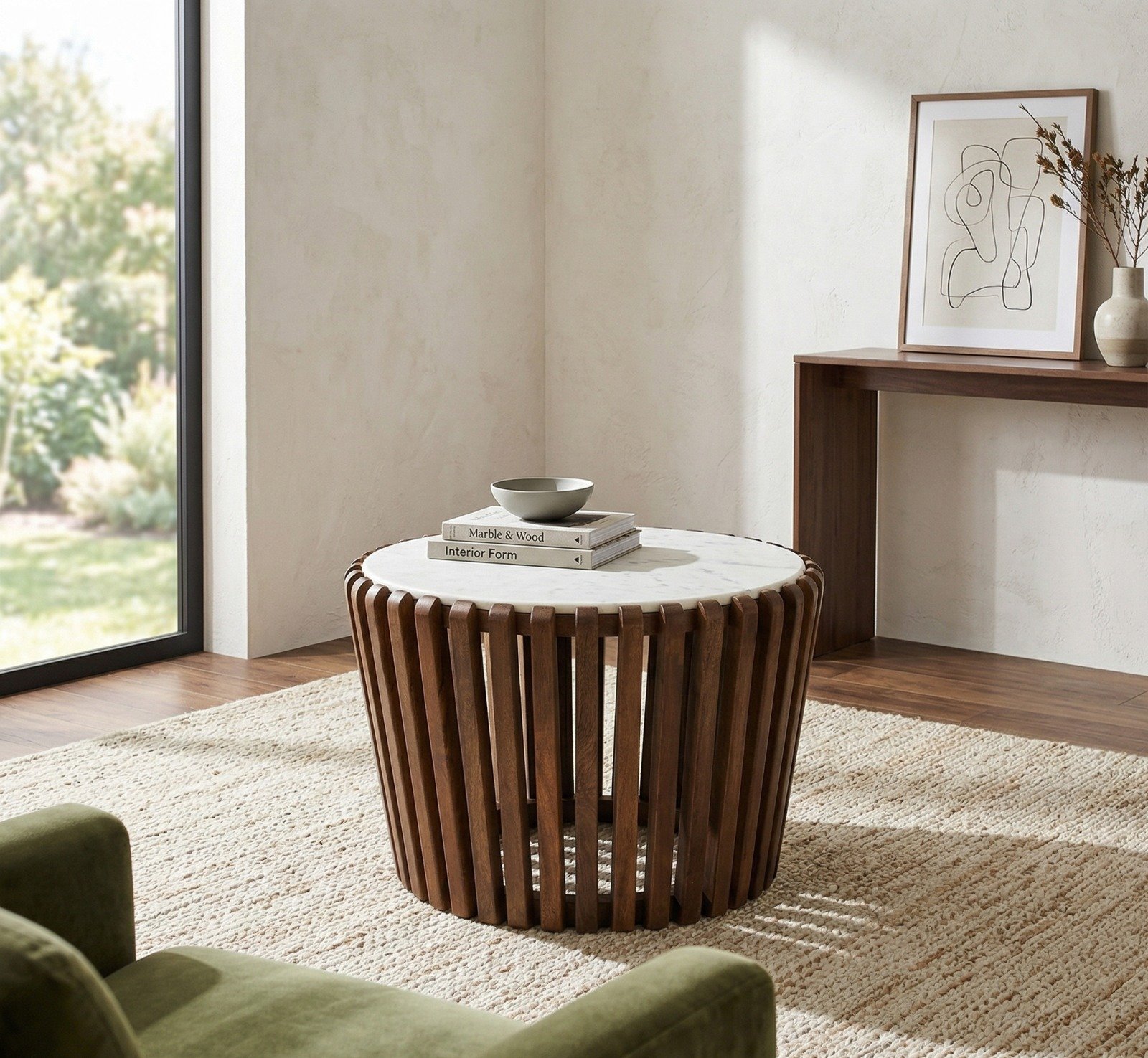 Elevate your decor with the PRITI Coffee Table Round Wood & White Marble—a perfect mix of form, function, and elegance that will captivate and complement any space.