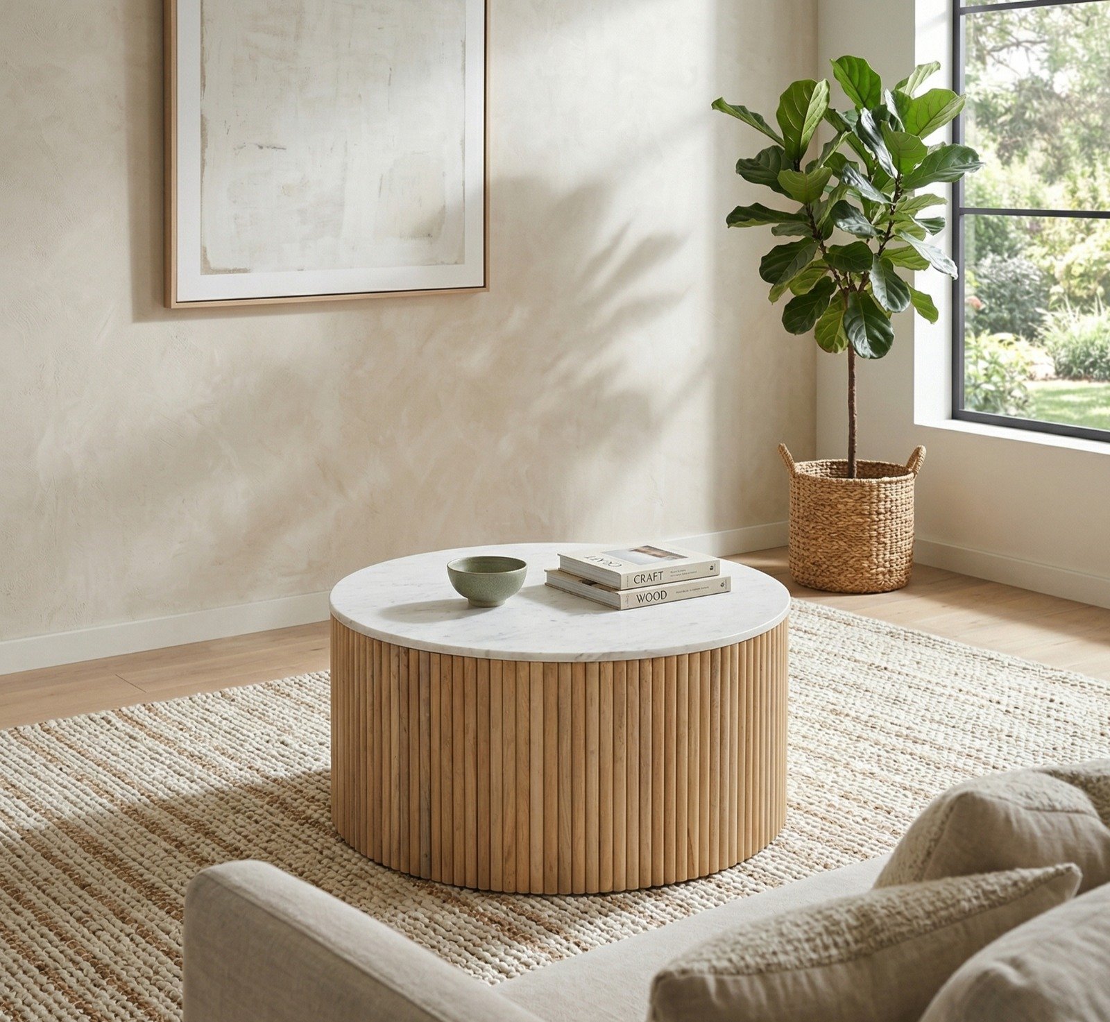 • Its minimalist design, with a solid wood base and a striking marble top, makes this coffee table a versatile addition to various interiors, from modern and industrial to more rustic or bohemian styles.