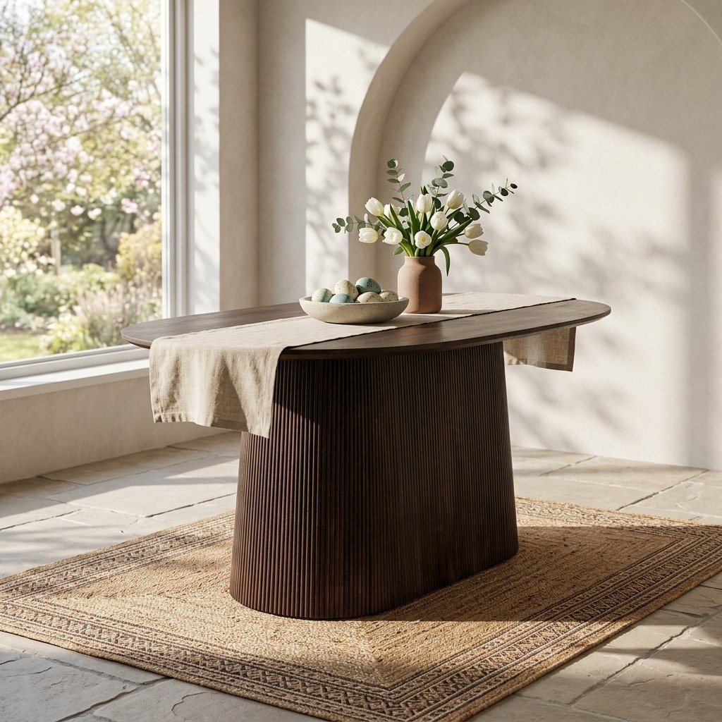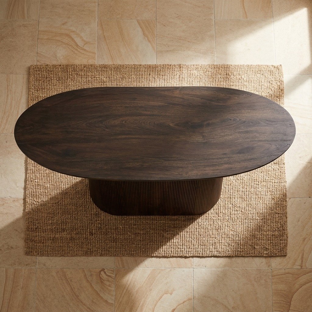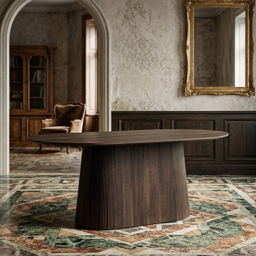 Introducing the PRITI Dining Table, a stunning centerpiece for your dining room that seamlessly blends style and practicality. Measuring 180 cm, this table features a unique oval design inspired by Scandinavian aesthetics, making it a perfect fit for both modern and traditional interiors. Available in three sizes—180 cm, 200 cm, and 230 cm—you can choose the one that best suits your space and entertaining needs. Dining Table Dark Brown 180 cm