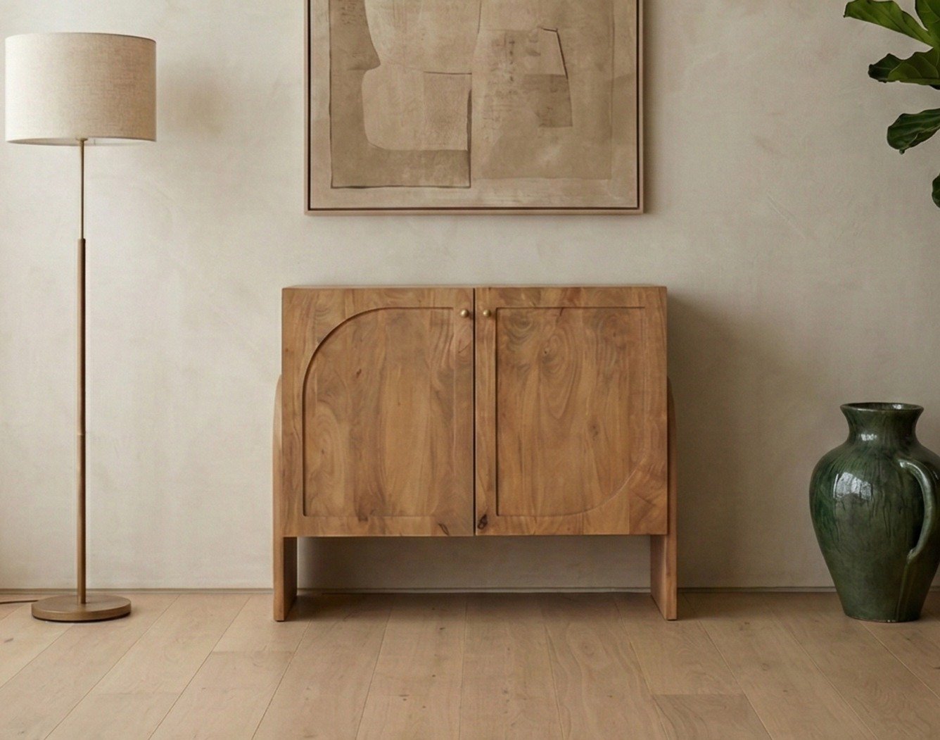 Artful Detail: Showcases arched inlay front panels, adding visual rhythm, depth, and sculptural charm to the overall design.