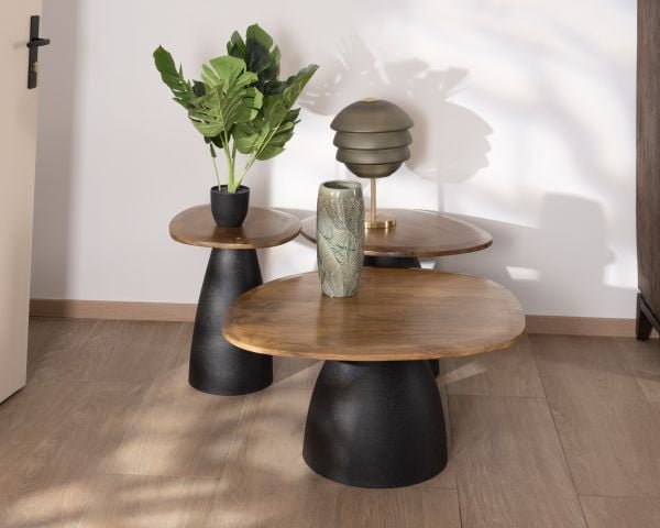 Apportez une touche de nature et de modernité à votre salon avec l’ensemble de trois tables basses Daun, fabriquées en manguier massif légèrement teinté et pieds en métal noir. Inspirées des formes organiques de la nature, ces tables d’appoint aux lignes douces et galbées offrent à la fois fonctionnalité, esthétisme et chaleur. Ensemble de trois tables basses en