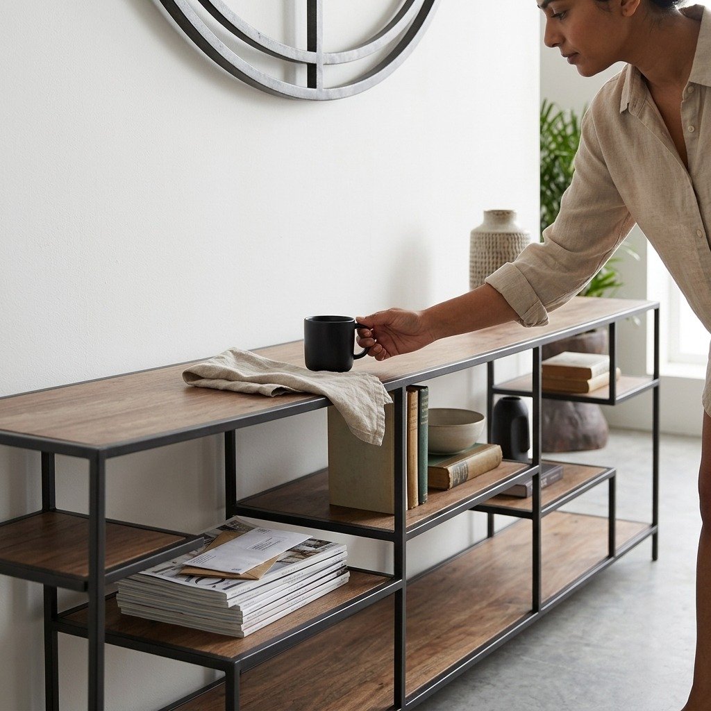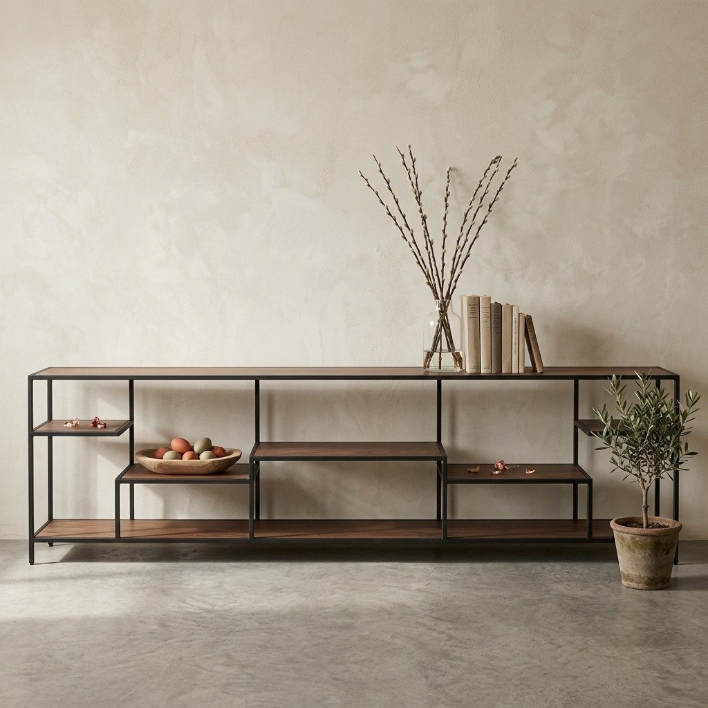 Cette étagère basse industrielle en manguier est équipée de cinq étagères, offrant un espace de rangement généreux pour organiser vos livres, décorations ou objets de collection. Chaque plateau est réalisé en manguier massif de 16 mm, un bois reconnu pour sa solidité et sa beauté naturelle. La teinte naturelle du manguier met en valeur ses grains distinctifs, apportant chaleur et authenticité à votre intérieur. Le plateau supérieur sert également de surface de présentation pour vos objets décoratifs, plantes ou souvenirs de voyage. Grâce au vernis polyuréthane, l’étagère bénéficie d’une protection durable contre les rayures et les taches tout en conservant un fini lisse et élégant. étagère basse industrielle en