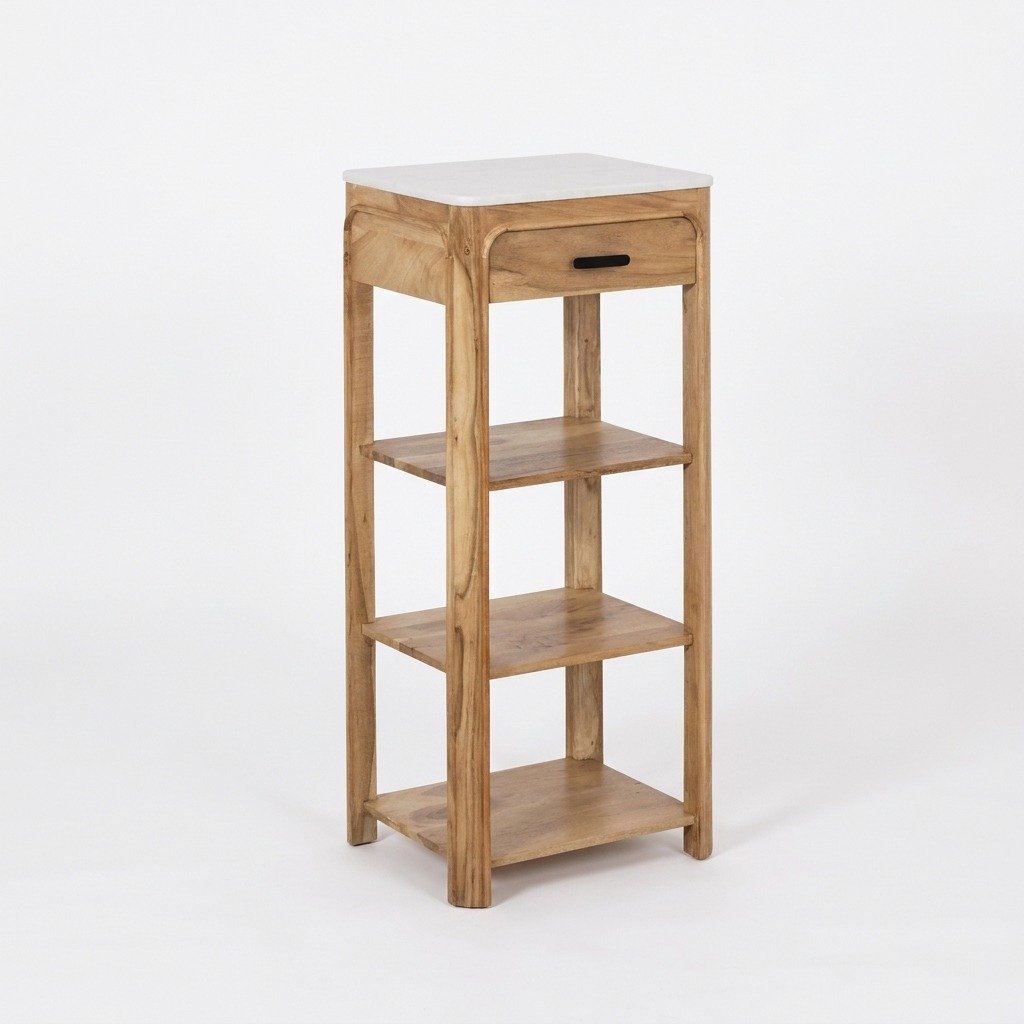 Designed with practicality in mind, the shelf features one discreet drawer for storing personal items, keys, or other essentials out of sight. Additionally, three open shelves provide ample space for baskets, books, or decorative objects, allowing you to organize and display your belongings beautifully. The open-frame construction creates a light, airy feel, making the unit appear less bulky while enhancing the overall aesthetic of your room. Forest Edge Shelf in Solid Wood