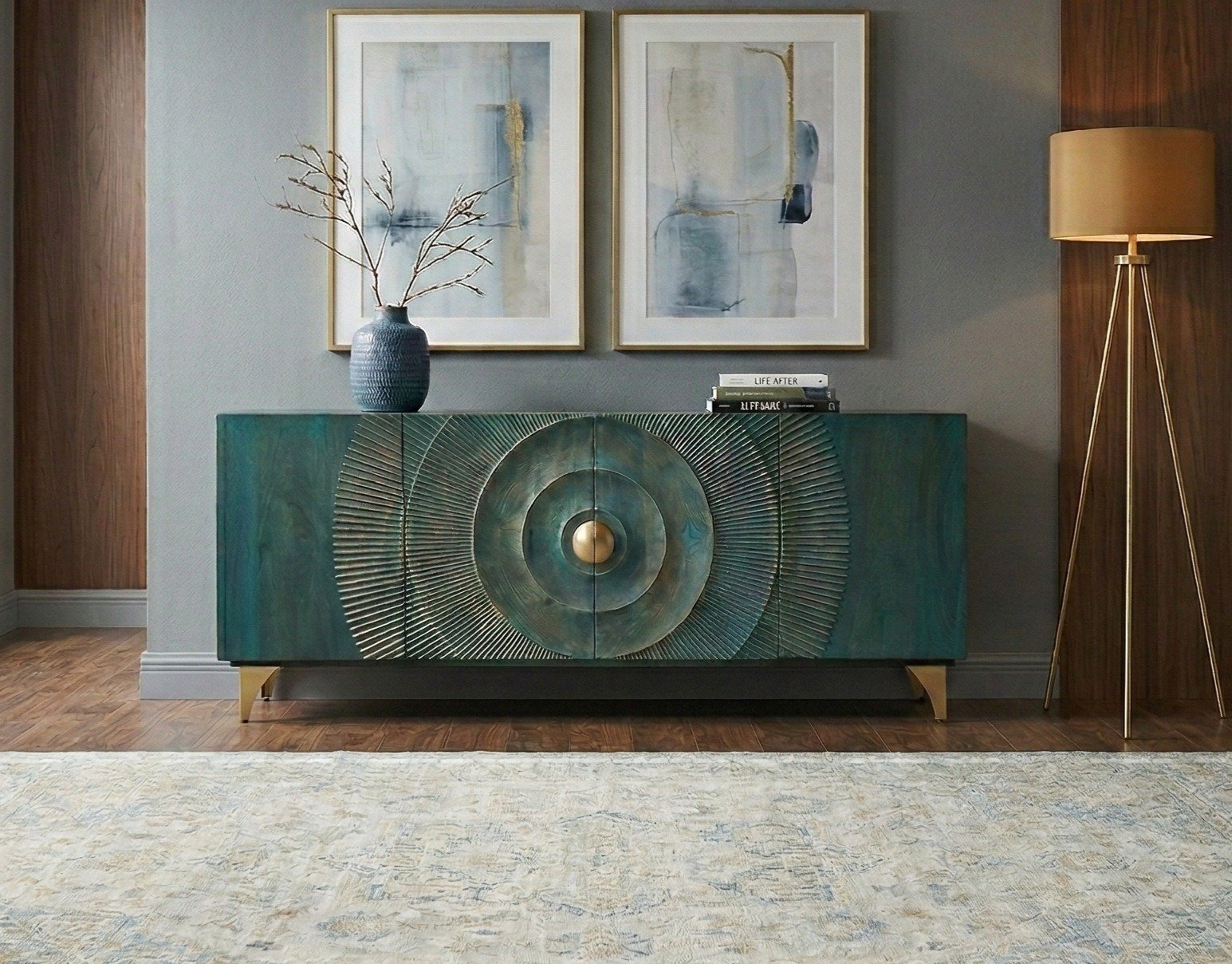 The Handcrafted Wooden Golden Sunset Sideboard is a luxurious statement piece that combines artistic design with functional storage, making it perfect for modern, contemporary, or Art Deco-inspired interiors. Featuring a turquoise body accented with gold-toned details, this sideboard immediately draws the eye with its vibrant and sophisticated aesthetic.