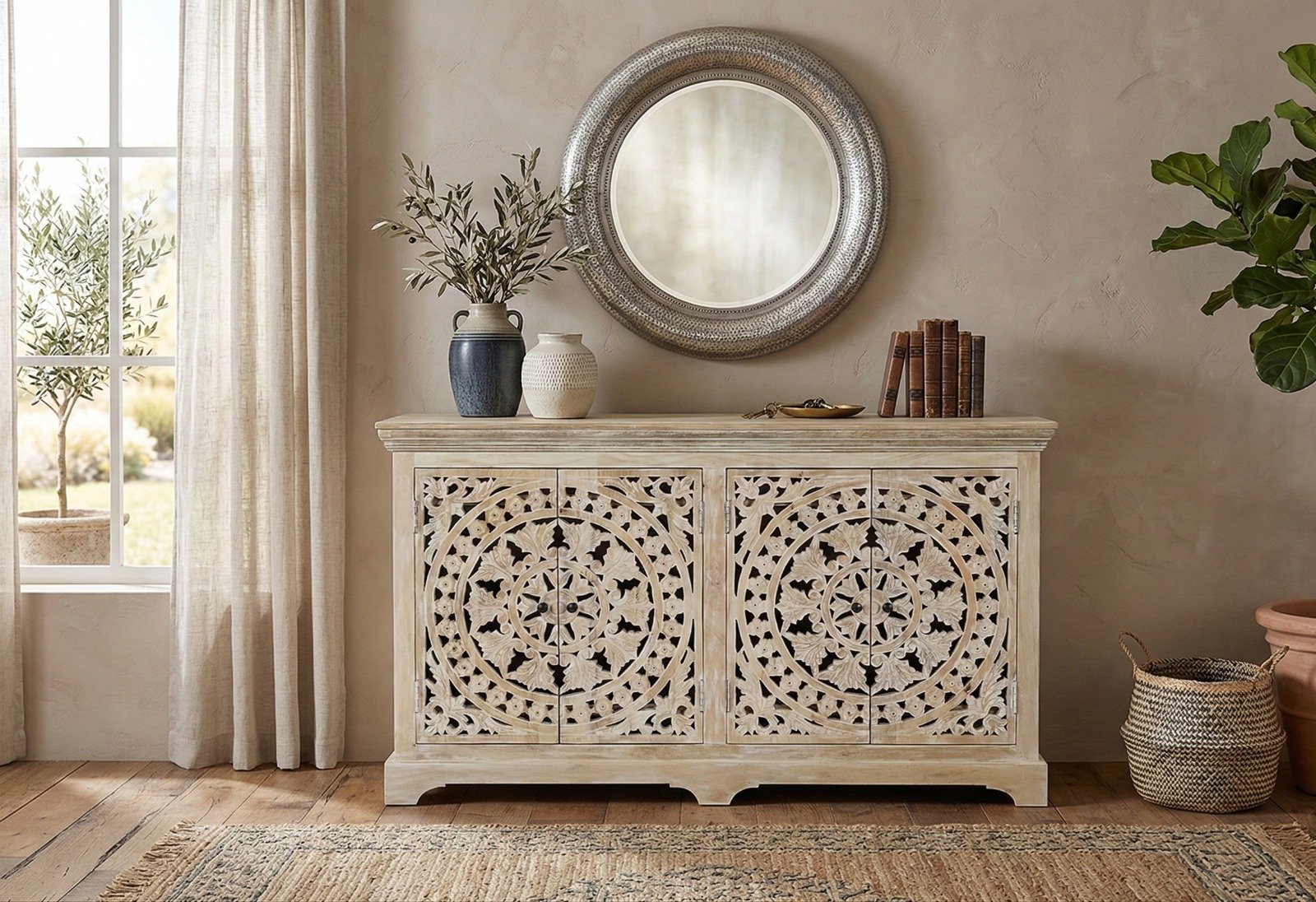 Design: Featuring intricate hand-carved detailing across its doors, this sideboard reflects traditional craftsmanship at its finest. The elegant carvings showcase floral and geometric motifs, giving the piece an artisanal charm and timeless appeal.