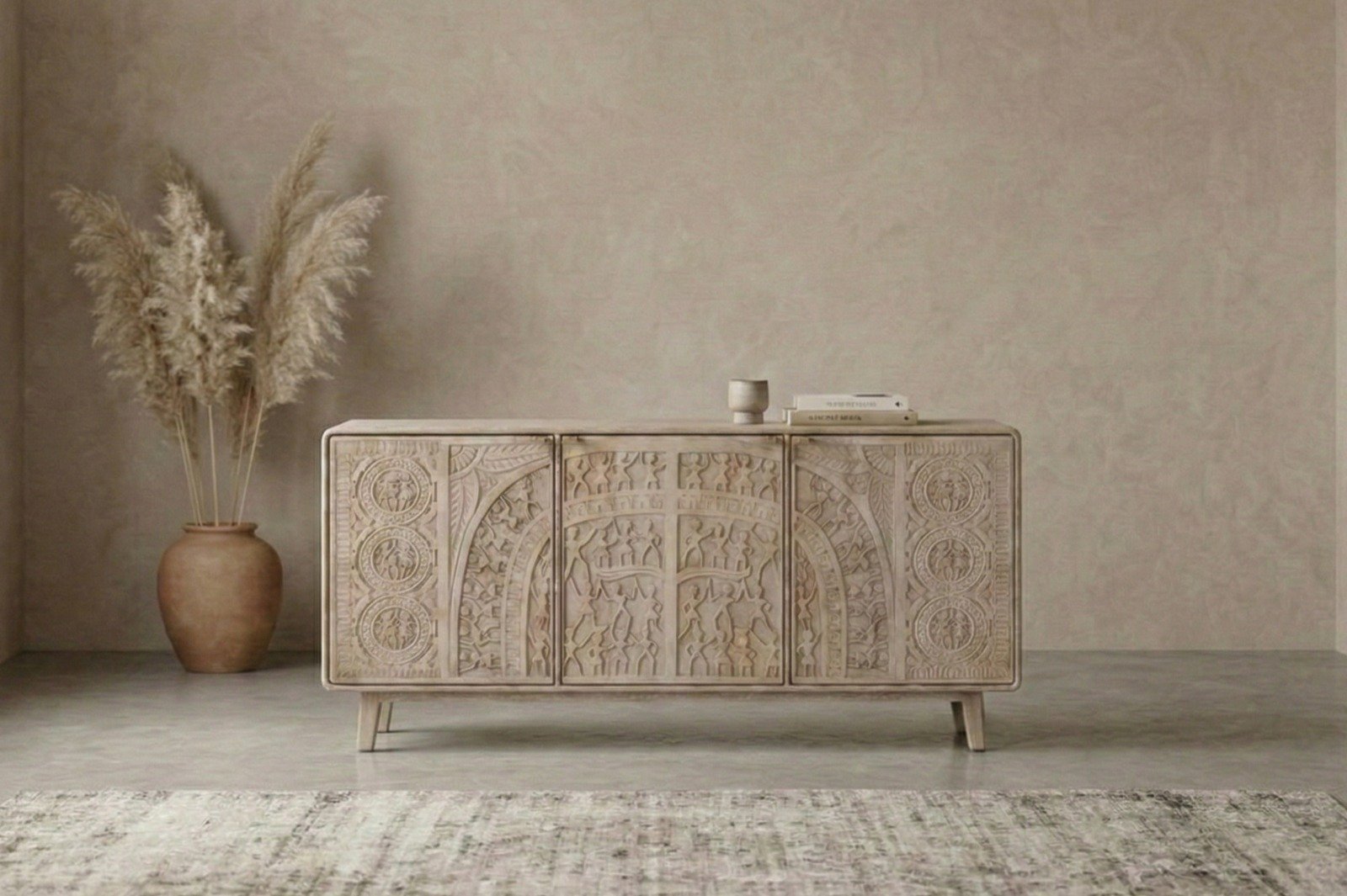 The biggest highlight of this furniture piece is its intricate and unique hand carving, inspired by Warli art. Warli art is renowned for its storytelling elements and geometric patterns, and this rich heritage has been delicately carved into each panel of the cabinet. Every carving is done by skilled artisans by hand, making each cabinet truly one-of-a-kind.