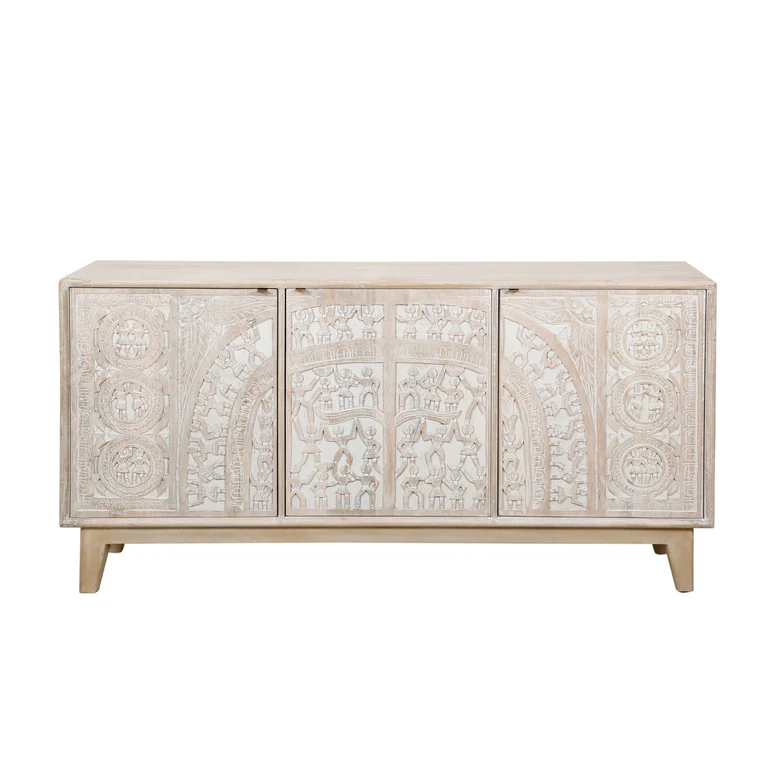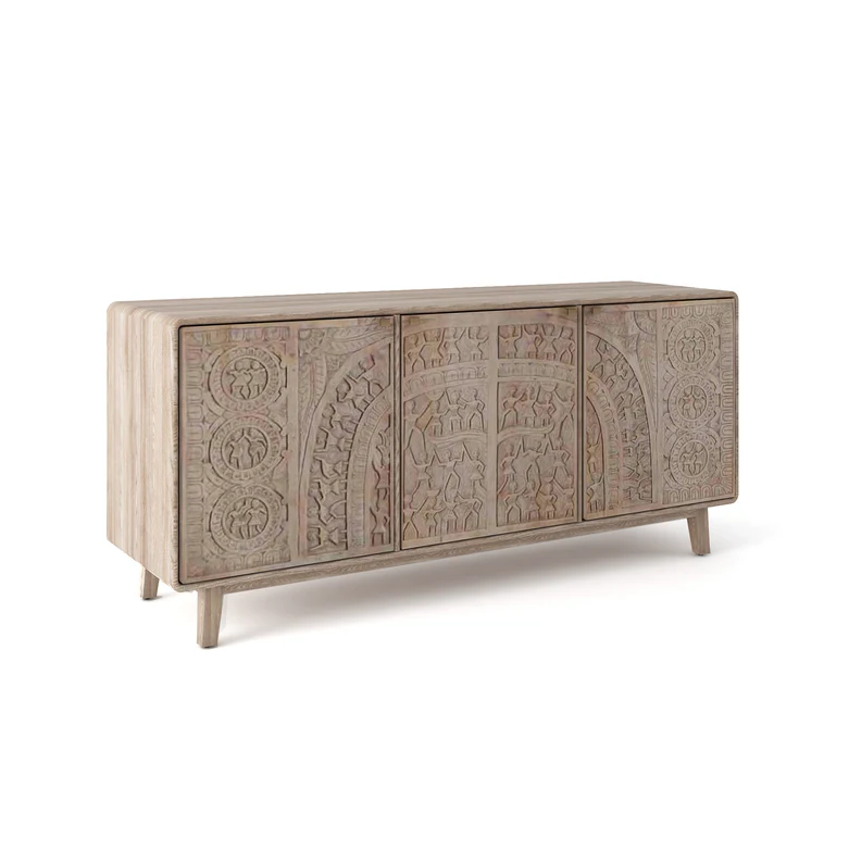 The biggest highlight of this furniture piece is its intricate and unique hand carving, inspired by Warli art. Warli art is renowned for its storytelling elements and geometric patterns, and this rich heritage has been delicately carved into each panel of the cabinet. Every carving is done by skilled artisans by hand, making each cabinet truly one-of-a-kind.