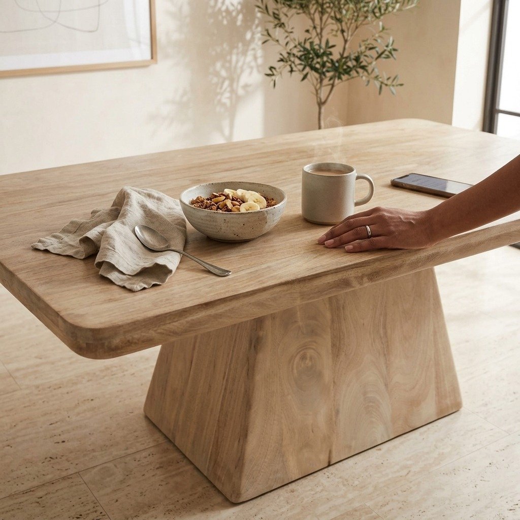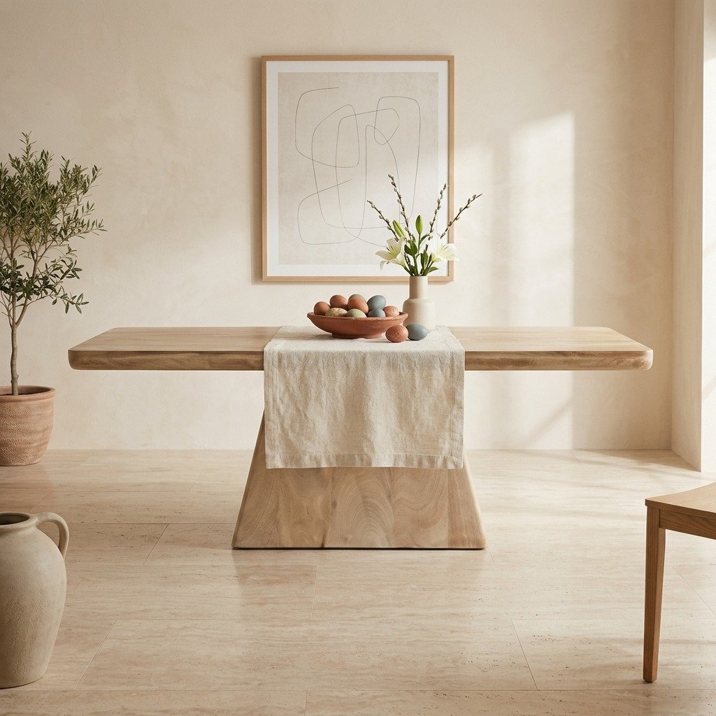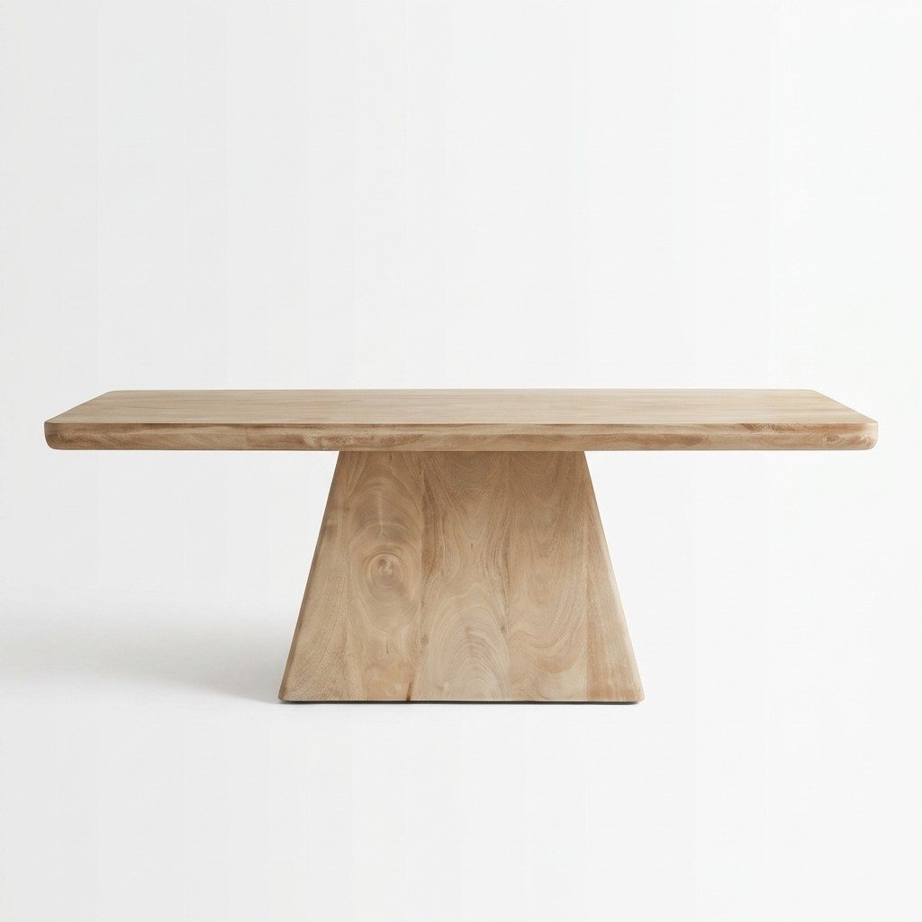 Featuring a thick rectangular tabletop and a bold trapezoidal pedestal-style base, this coffee table embodies modern minimalism and Scandinavian-inspired design. The natural finish enhances the inherent beauty of mango wood, making it a timeless addition to any home. Its geometric base adds visual interest and stability, turning this functional piece into a statement centerpiece for your living space.