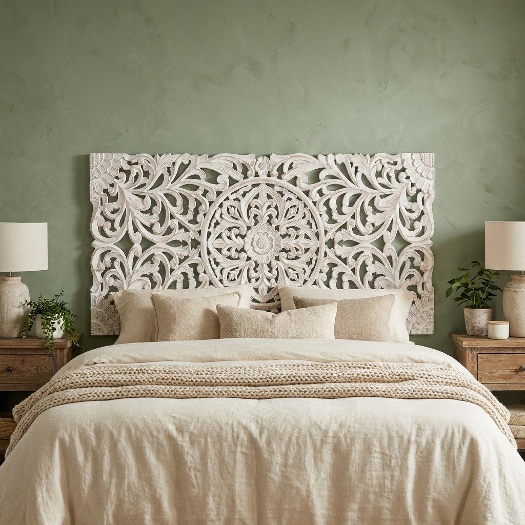 • In a bohemian or eclectic interior, the mix of materials and finishes can serve as an artistic focal point, blending seamlessly with layered textures and patterns.PRITI Headboard Home Decor White Golden Wood