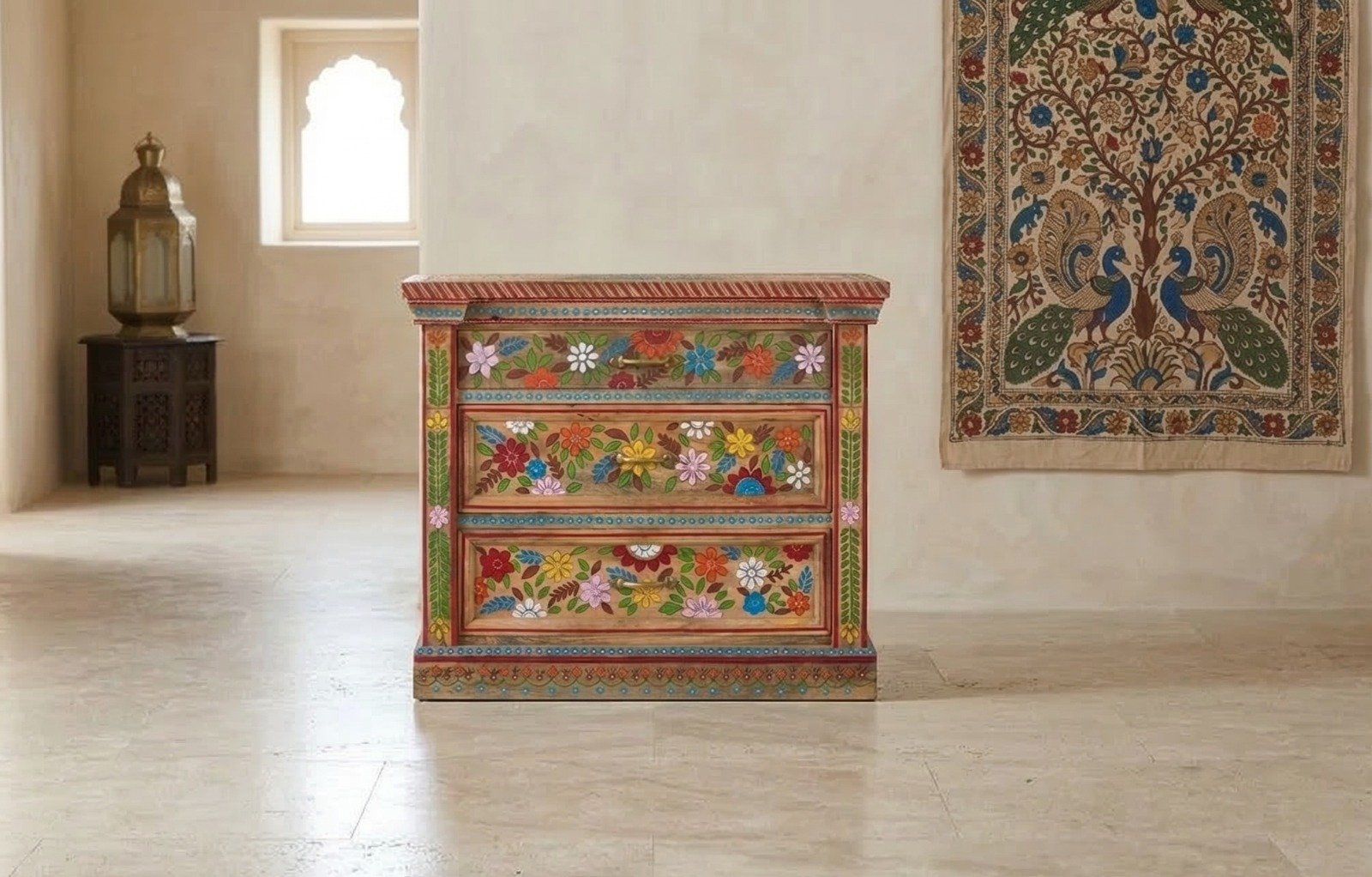 Bring the enchanting essence of India into your home with the PRITI Iteca Chest of Drawers. This exquisite piece blends solid wood craftsmanship with hand-painted artistic detailing, making it a true work of art full of character and charm. Itika Wooden Chest of Drawers