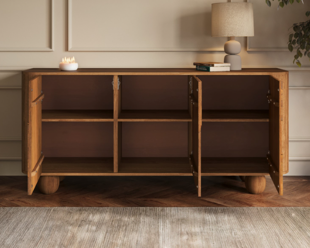 The push-catch doors create a sleek, handle-free look, offering effortless functionality while maintaining a minimalist design. Elevated on unique rounded ball feet, the sideboard adds visual interest and a subtle twist to its clean, structured lines.