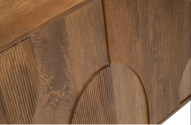 Designed with modern aesthetics in mind, the sideboard features hand-carved ribbed detailing across the three doors, adding texture and a contemporary touch to this statement piece. Behind these doors, multiple spacious shelves provide ample storage for dinnerware, linens, or other household essentials, keeping your space organized without compromising style. Exclusive Ivan Wood Sideboard with Ball Feet