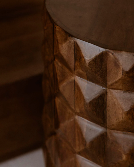 La Mesa Auxiliar Redonda Vilna es una pieza de diseño elegante y funcional, perfecta para complementar cualquier espacio de tu hogar. Fabricada en madera de mango maciza, combina resistencia y belleza natural, ofreciendo un acabado duradero y cálido. Su diseño geométrico tallado aporta un toque decorativo único, convirtiéndola en un elemento visual atractivo que resalta en cualquier estancia. Mesa Auxiliar Redonda de