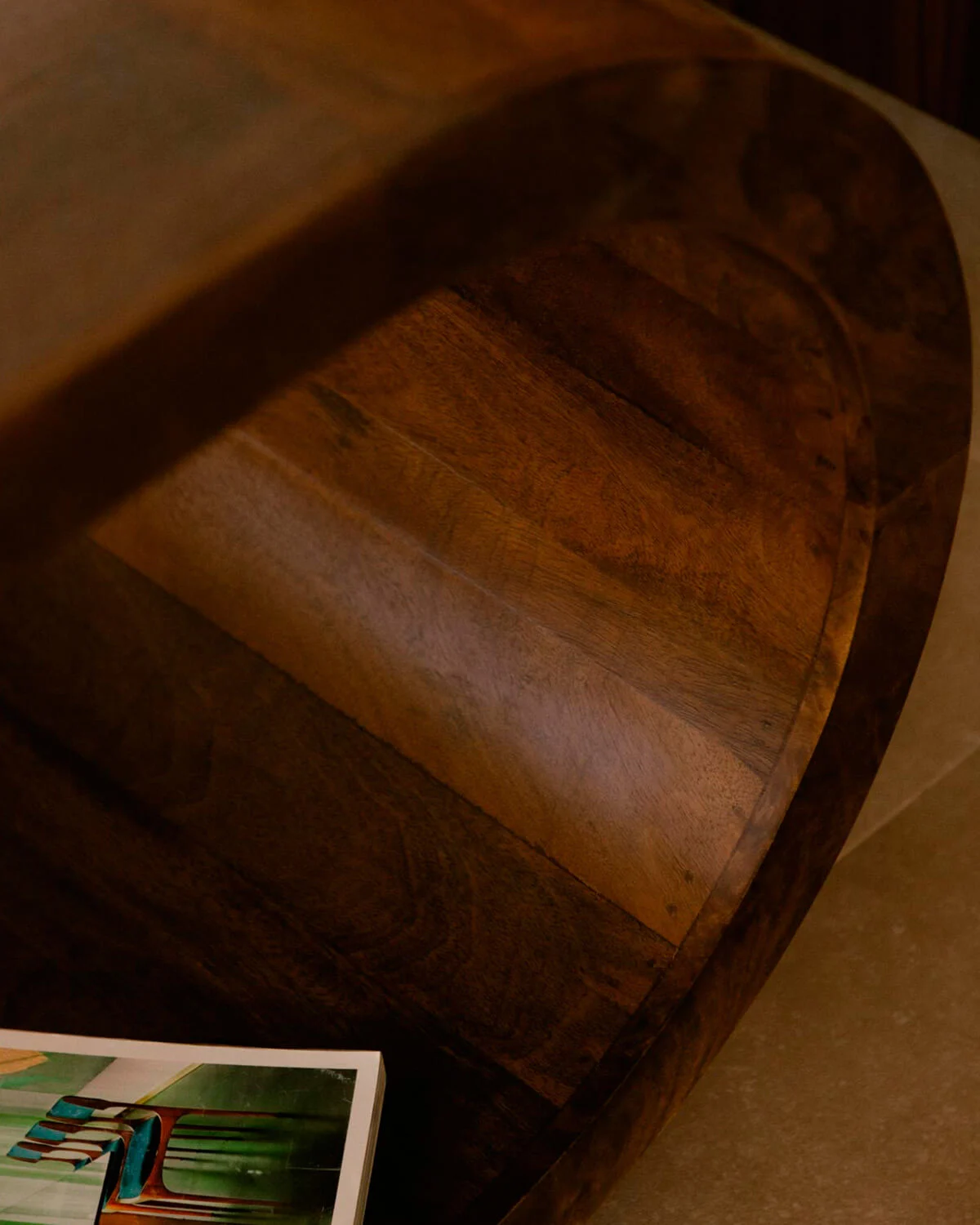 Com dimensões de 56×40 cm, oferece o espaço perfeito para apoiar candeeiros, bebidas, livros, plantas, portáteis ou qualquer acessório decorativo. As suas linhas curvas adicionam suavidade ao desenho e tornam a peça visualmente moderna e elegante, transformando-a num elemento que se destaca no ambiente sem perder funcionalidade. Esta mesa lateral de madeira de manga é especialmente prática em rotinas do dia a dia, permitindo manter os objetos mais importantes sempre ao alcance.