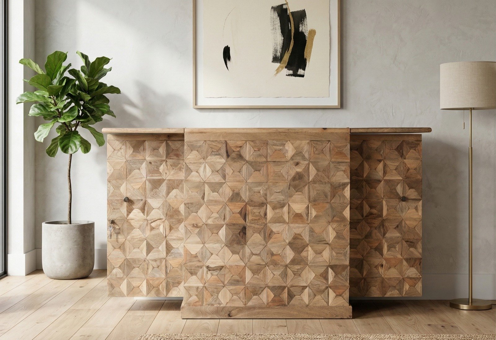 Meuble bar en bois de manguier – Design géométrique et fonctionnalité exceptionnelle