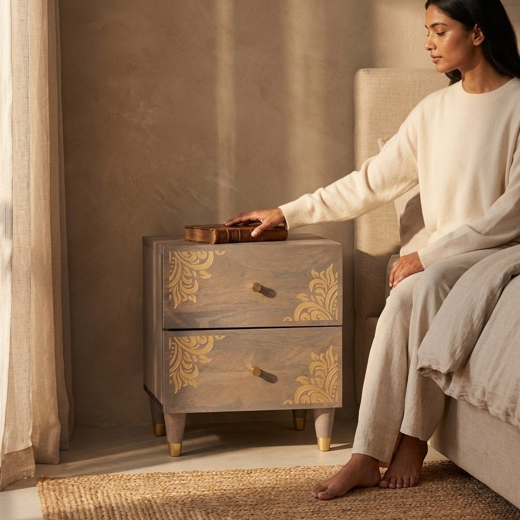 Idéal pour les recherches Google telles que Meuble de chevet moderne en bois massif, table de nuit moderne en manguier, chevet design avec tiroirs, ou mobilier de chambre contemporain, ce meuble combine esthétique, fonctionnalité et qualité artisanale pour un intérieur élégant et durable.