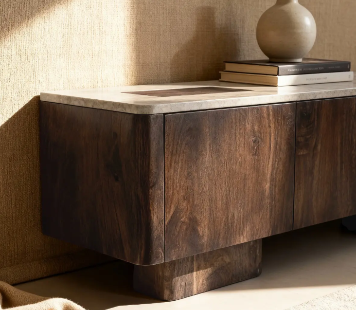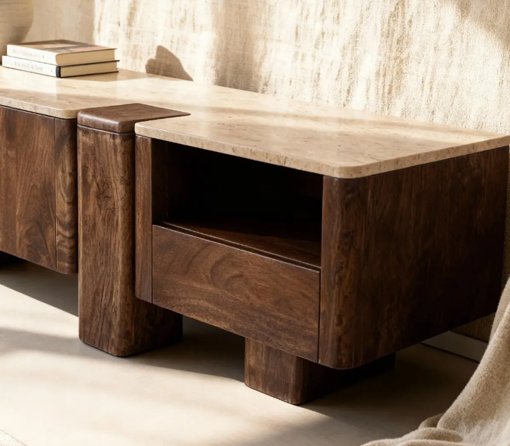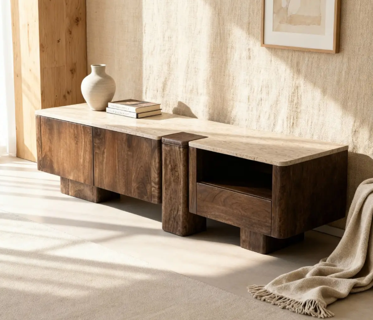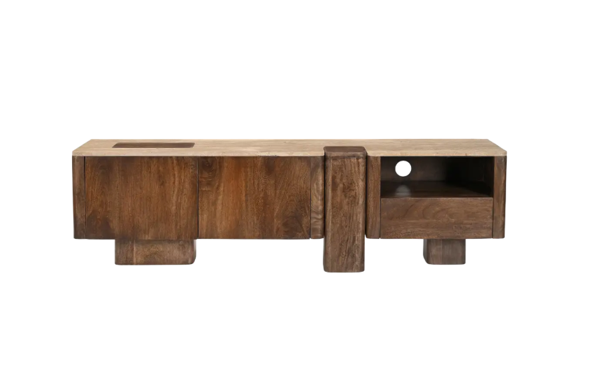 Meuble TV en bois de manguier et travertin Carola – Élégance naturelle et design contemporain