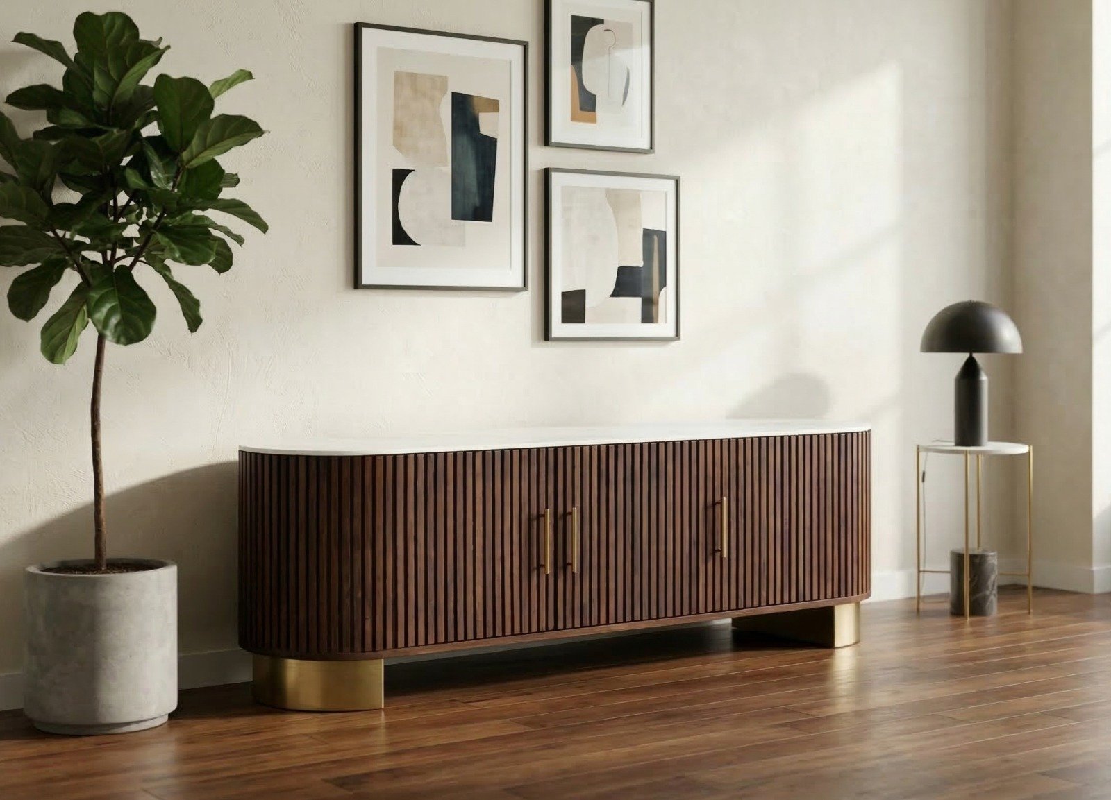 Le plateau en marbre synthétique blanc veiné de gris ajoute une note luxueuse tout en restant facile à entretenir au quotidien. La façade est composée de trois portes en bois de manguier massif, décorées de lattes verticales élégantes, offrant un grand espace de rangement pour vos appareils multimédias, accessoires et documents. Les poignées et le piètement en métal doré apportent une touche de distinction et renforcent le caractère haut de gamme de ce meuble TV.