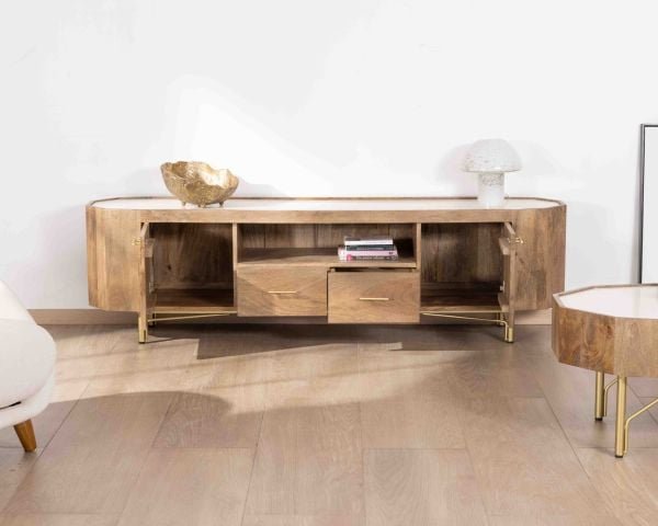 Meuble TV en manguier massif et terrazzo blanc