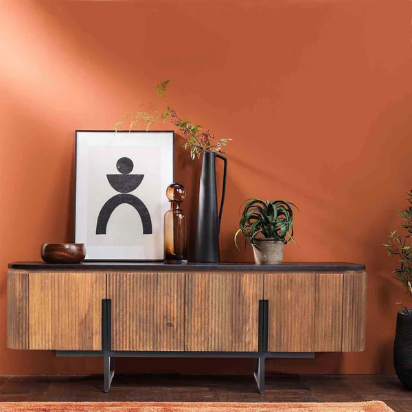 Fabriqué en bois massif de manguier avec un coloris light honey, ce meuble reflète la beauté naturelle du bois tout en garantissant robustesse et durabilité. La finition métal noir ajoute un contraste moderne qui complète parfaitement le marbre noir, offrant un look raffiné et haut de gamme.
