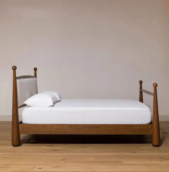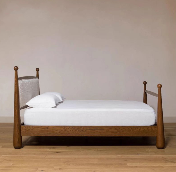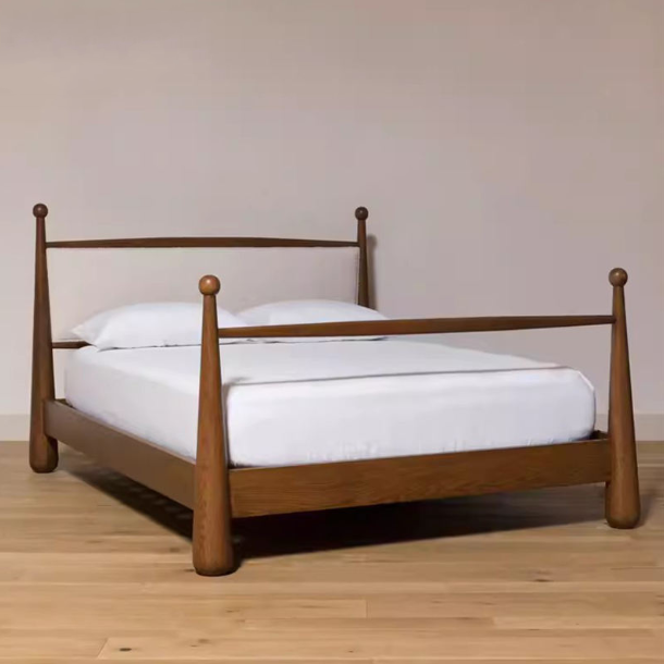 Designed for comfort and long-lasting stability, the bed frame supports both queen- and king-size mattresses, making it suitable for master bedrooms, boutique hotels, luxury apartments, and contemporary guest rooms. The handcrafted details, including rounded finials and gently tapered legs, reflect expert woodworking techniques that highlight the natural beauty of the wood grain.