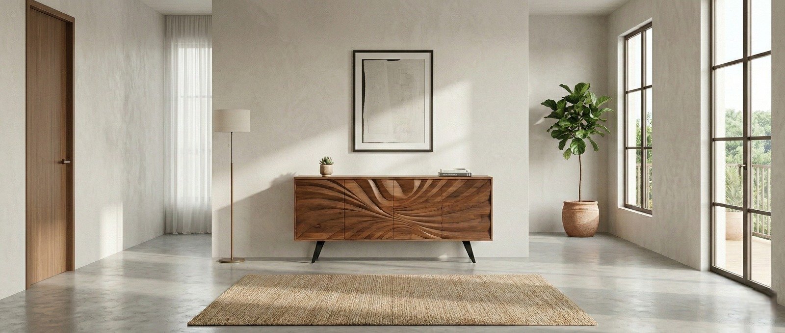 The Modern Natural Interiors Wooden Sideboard is a beautifully crafted piece that combines modern elegance with practical functionality, making it a standout addition to any living or dining space. Its striking 3D patterned front immediately draws attention, adding depth, texture, and visual interest while complementing interiors styled with natural tones and organic materials.