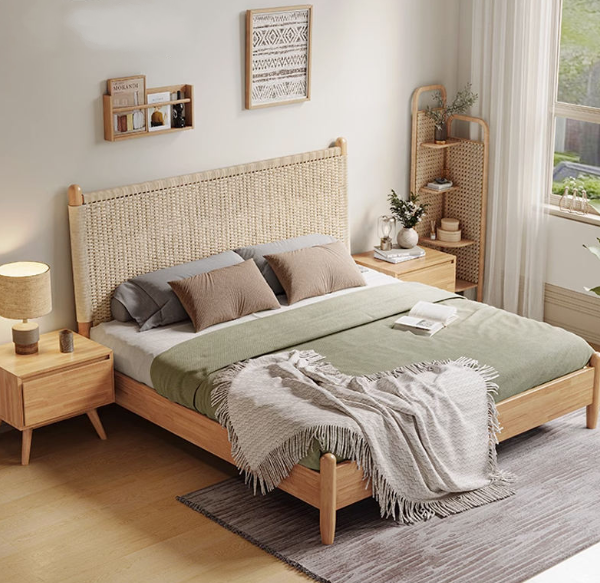 Natural Rattan Solid Wood King Bed – Elegant Handwoven Headboard Bed for Modern Homes & Hotels