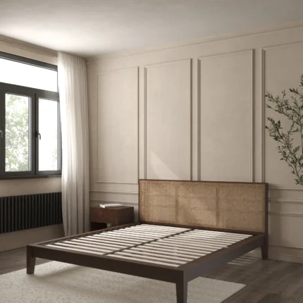 The bed frame is constructed from high-quality solid wood, offering exceptional durability, stability, and long-lasting performance. Its rich walnut-tone finish provides an elegant contrast to the light rattan weave, creating a cozy yet sophisticated aesthetic. The minimalist structure, rounded wooden legs, and clean lines give the bed a warm, Scandinavian-inspired appeal ideal for any modern décor theme. Natural Rattan Solid Wood King Bed