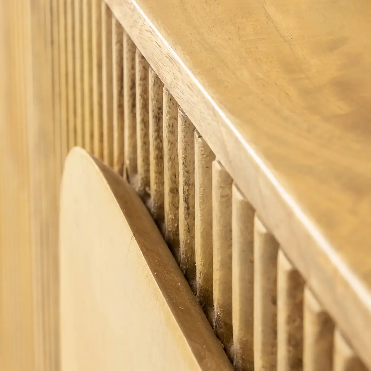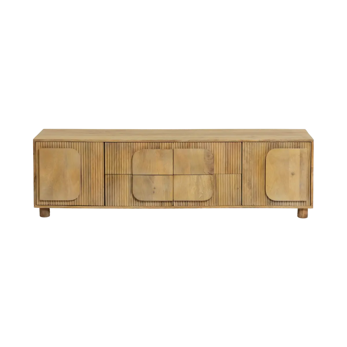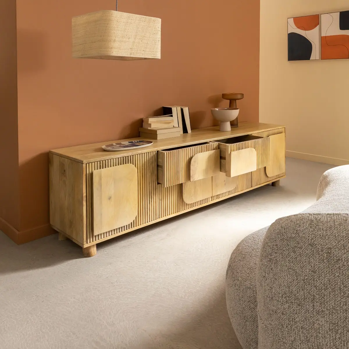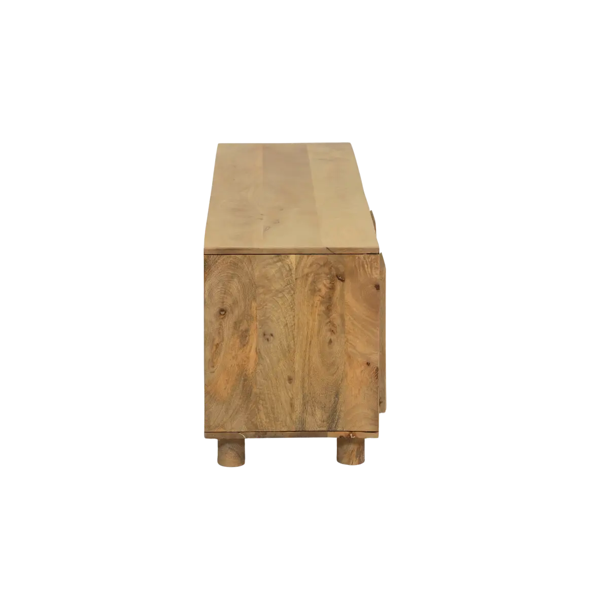 La teinte claire du bois de manguier met en valeur son veinage naturel et apporte une atmosphère douce et lumineuse à votre intérieur. Chaque détail a été pensé pour créer un équilibre parfait entre modernité et authenticité. Les volumes arrondis et les lames verticales rappellent l’identité graphique de la collection Caël, offrant un meuble à la fois tendance, chaleureux et intemporel. Son format allongé et ses pieds bas discrets renforcent son allure minimaliste tout en assurant une excellente stabilité.