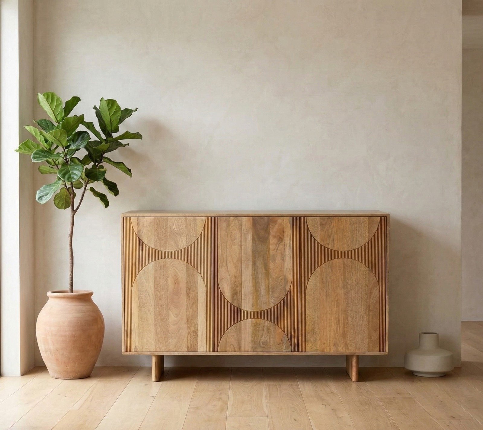Materials and Finish: Crafted from high-quality wood, the PRITI sideboard is designed for durability and longevity. The wood’s natural grain is beautifully highlighted by the neutral finish, which enhances its organic warmth while ensuring the piece blends effortlessly with different color palettes and decor styles. The patterned detailing on the doors is carefully crafted, adding depth and character to the piece without overpowering its overall design. The sideboard’s finish is smooth and polished, providing a refined look that also protects the wood from everyday wear and tear.