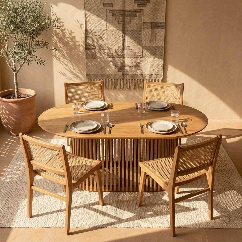 The brown wood finish and oval shape of the PRITI Dining Table offer a versatile aesthetic that can enhance various decor styles: